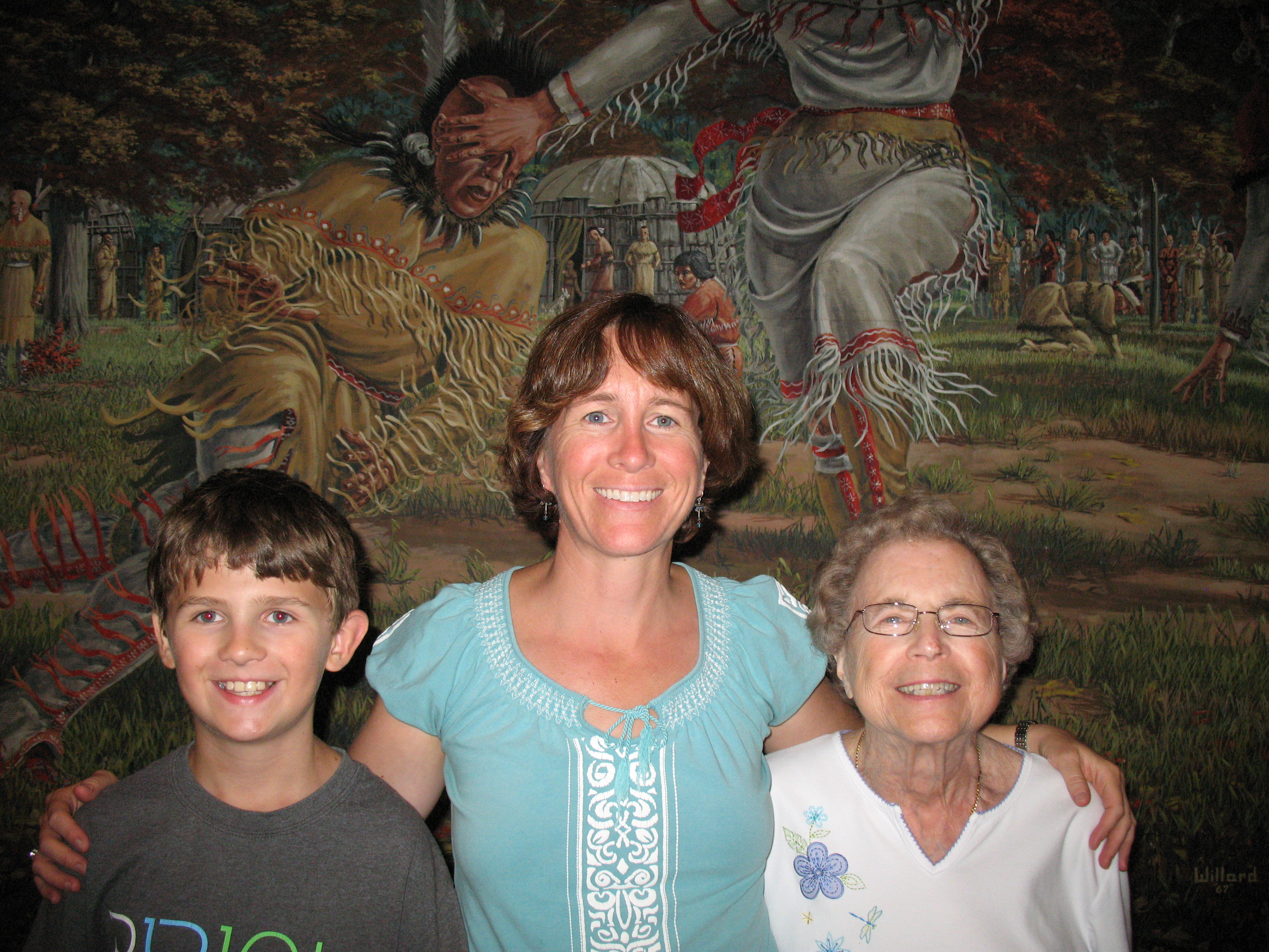 Yes, it’s been a full week. Jane invited us over again to swim at her condo complex. Some childhood friends of mine invited me to go with them to a murder mystery theater/dinner. Jane took us to Findlay Market (farmers market) in Cincinnati again which was quite fruitful. Ba dum bum. We drove with Mom to Oxford to see my alma mater, Miami University, and then to nearby Hueston Woods State Park and ate dinner at the lodge. Laurel finished knitting her second project, fingerless mittens, made with Jane’s 40-year-old yarn found upstairs. Today Aunt Verna, my dad’s sister, visited; and we went to lunch together. Only four days left here in Ohio!