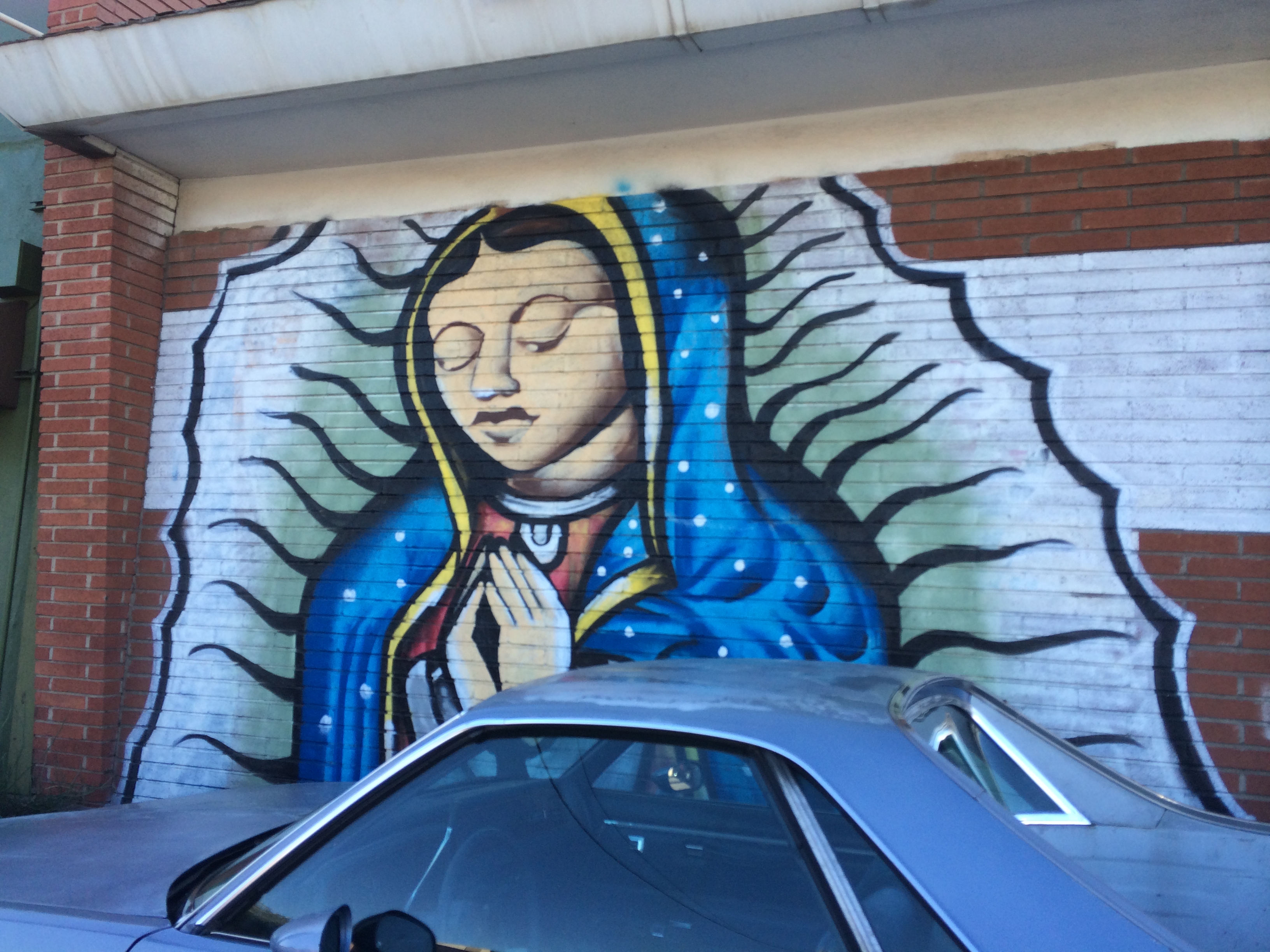This mural of Our Lady of Guadalupe is on the side of a business near our house. The next business has a variety of murals painted on it, including a portion of the Prayer of St. Francis of Assisi.