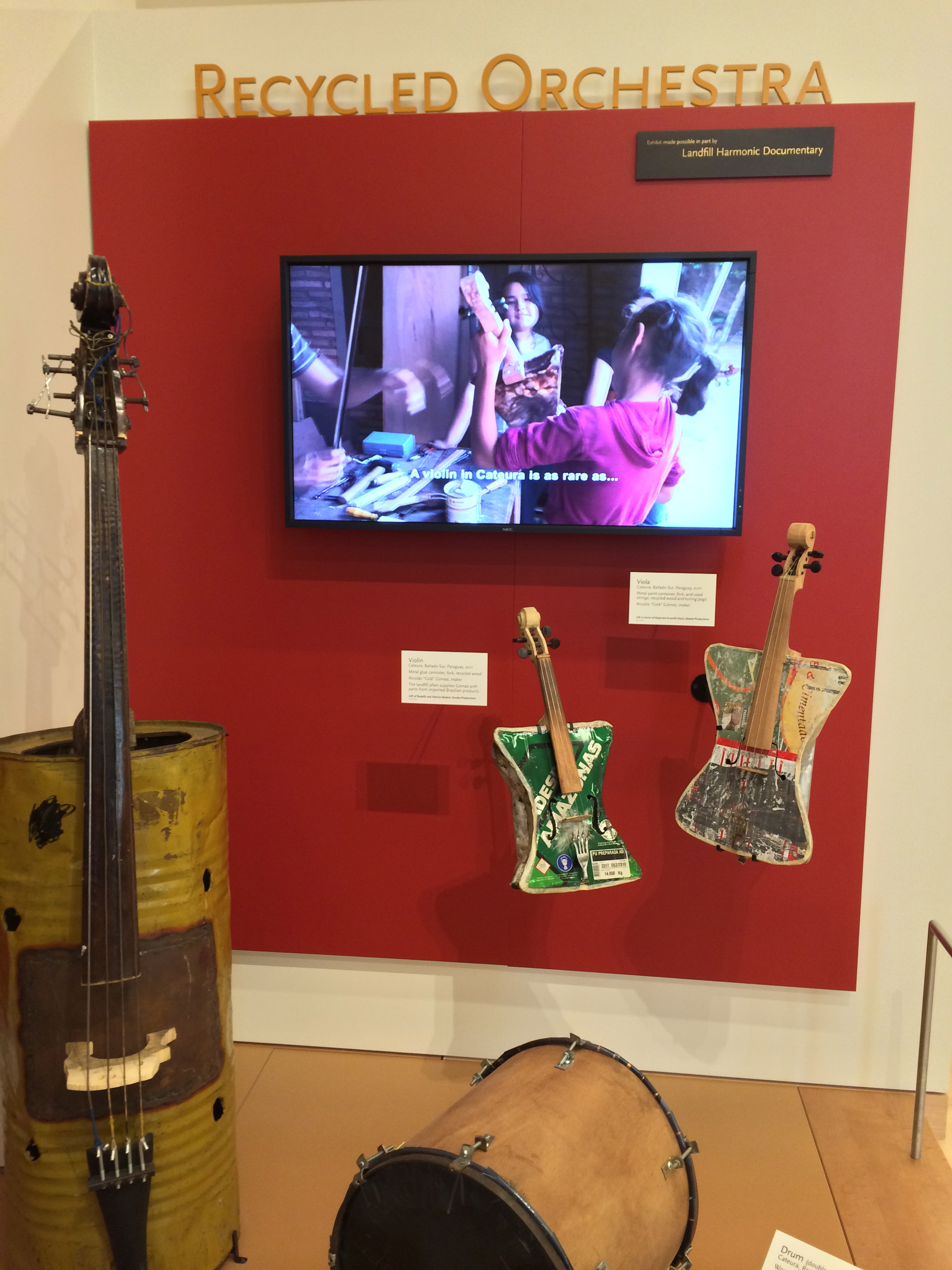 On that happy note, I’ll switch over to our visit to the Musical Instrument Museum today. It’s nearly 17 miles from our house, so we walked 3.7 miles to a bus stop and took a bus the remaining way. We took two buses home and only had to walk a couple blocks. To my surprise, the bus system here is cheap and extensive. The museum opened in 2010. The first-floor galleries include an artist gallery with memorabilia by famous musicians, such as John Lennon’s piano on which he composed “Imagine” and an experience gallery where you can play a harp, drums, guitar, all kinds of instruments. Upstairs is where most of the exhibits are. There are instruments from every country with information about the instruments and an audio tour given by television at each station. We wore headphones connected to receivers which communicated with each TV as we stood in front of it. One of my favorite exhibits showed a portion of a YouTube video and instruments from a children’s orchestra in Paraguay. The kids live in a neighborhood that’s on top of a landfill and, with the help of the orchestra director there, salvaged some trash from that landfill to make musical instruments. The kids are great musicians, and the oil-drum cello and other instruments sound just fine. I bought Charlie a t-shirt in the gift shop with info printed on it about the Landfill Harmonic. There’s a quote on the back of the shirt that says, “The world sends us garbage. We send back music.” I have included the link (or the actual video – depending on how it shows up) to the YouTube video below: