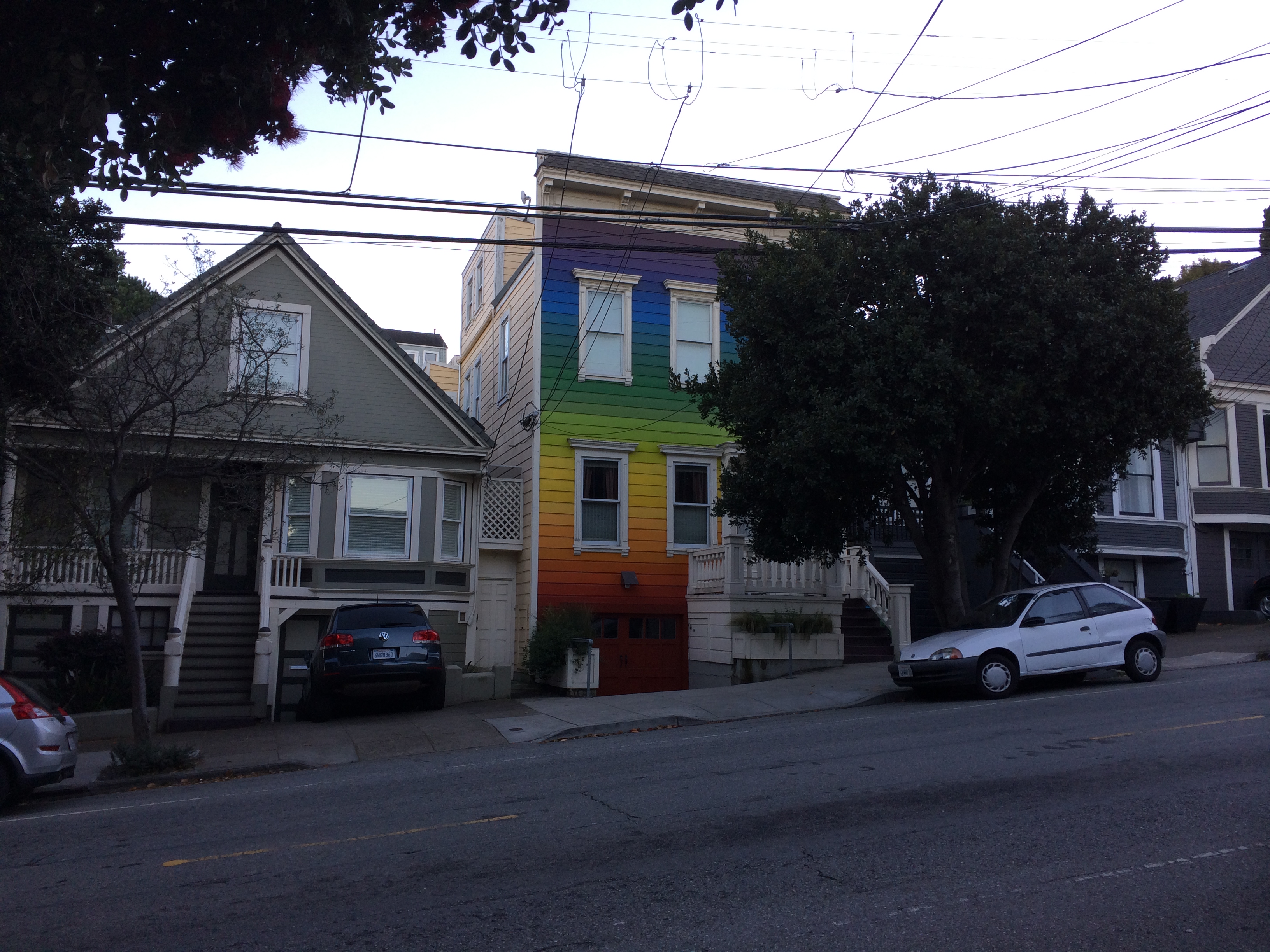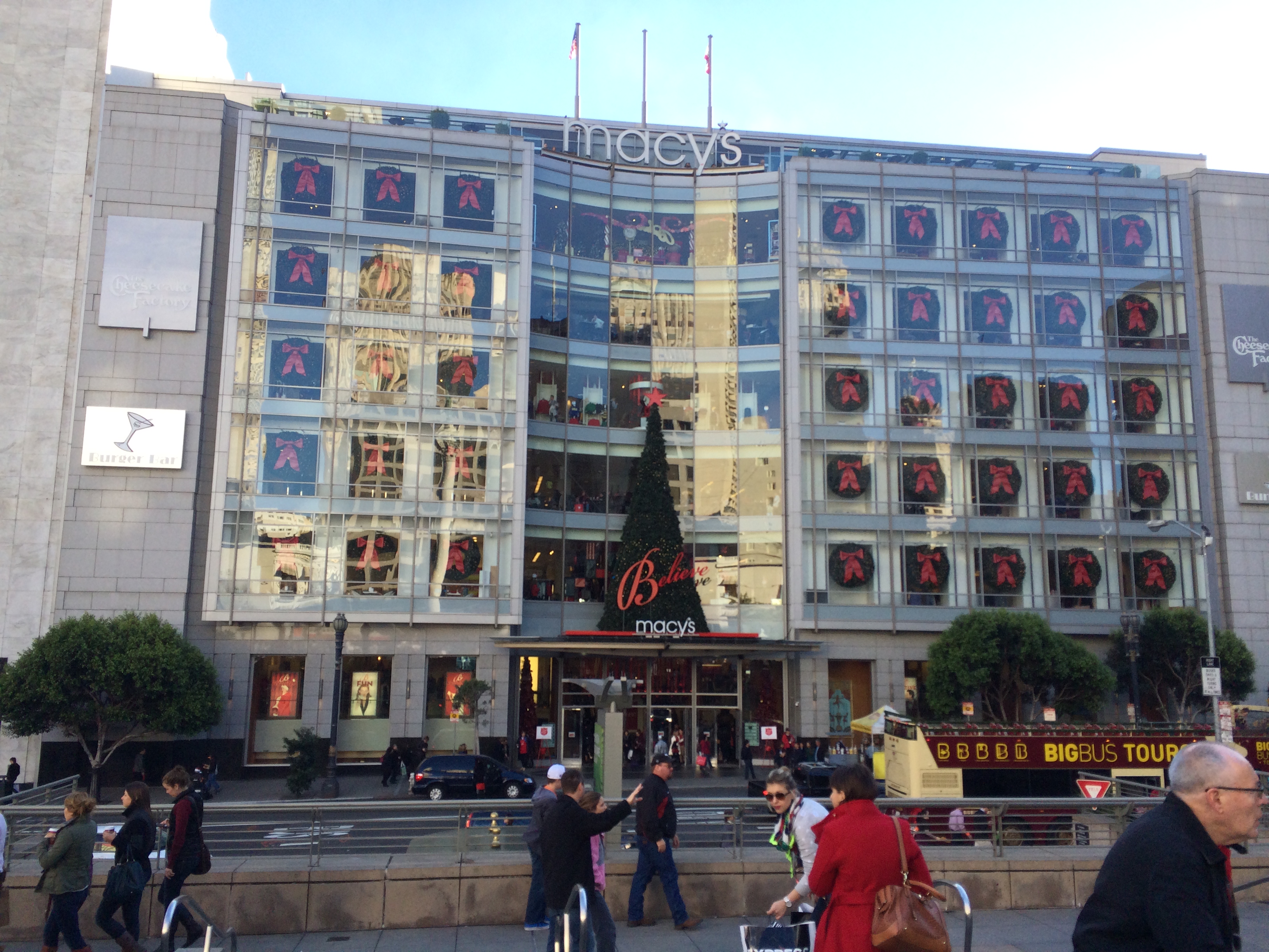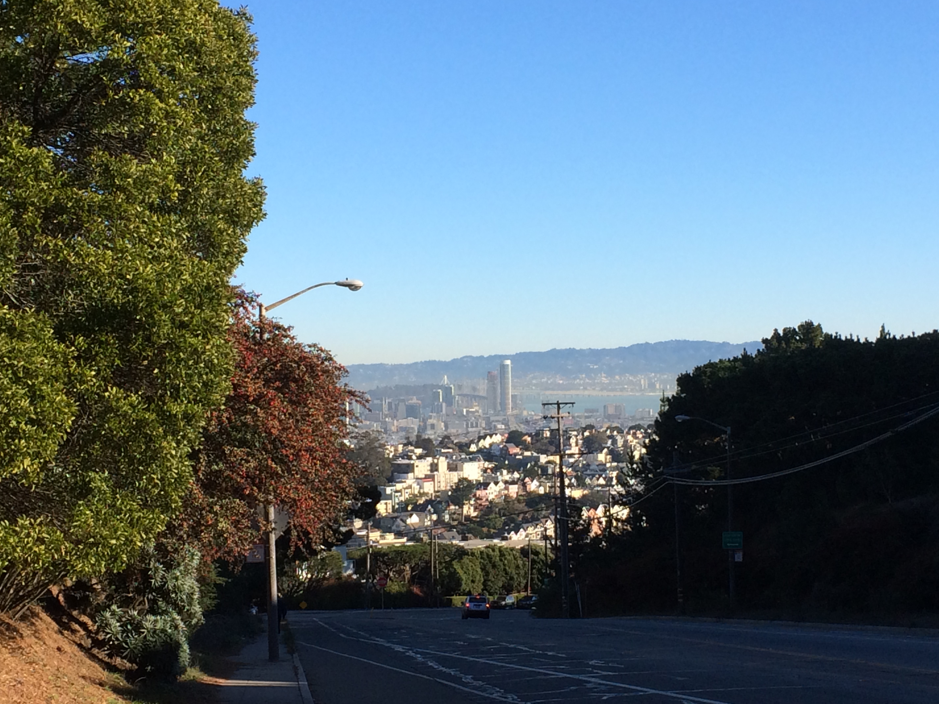 I was going to title this “I left my calves in San Francisco.” When I Googled that, I found that another blogger had already used those words as a title to describe her family’s SF trip. š (Not that those words are copyrighted – I just wanted to be original.) We’re staying in a tiny, walkout basement in the Twin Peaks neighborhood near the Castro. It was a very steep, 1.1-mile walk to Whole Foods this morning. We enjoyed the view and the quick, downhill jaunt; but we dreaded walking up those same streets with groceries. Indeed, the return trip was quite difficult. We had to stop more than once to slow our hearts, put down the bags, and take a drink. One block in particular seems to almost need handholds. I told Laurel I thought it would be a lot of fun to ride down those streets on a skateboard wrapped in bubble wrap or foam and then crash into a wall of fluff. The young men who live upstairs and own this house said we could take a bus almost door-to-door, so I guess we’ll do that next time. We also took the BART (Bay Area Rapid Transit) train downtown today and saw the Christmas decor in Union Square like we did two years ago when we were in SF for Thanksgiving. It’s a 1.7-mile walk from our house to the nearest train station so we got some good exercise today. I asked Laurel to throw the laundry from the washer into the dryer (in the garage) this evening because I didn’t think my thighs could handle the journey. Unfortunately she couldn’t figure out the weird dryer, so I had to be brave and use my legs to walk the few feet to the garage.