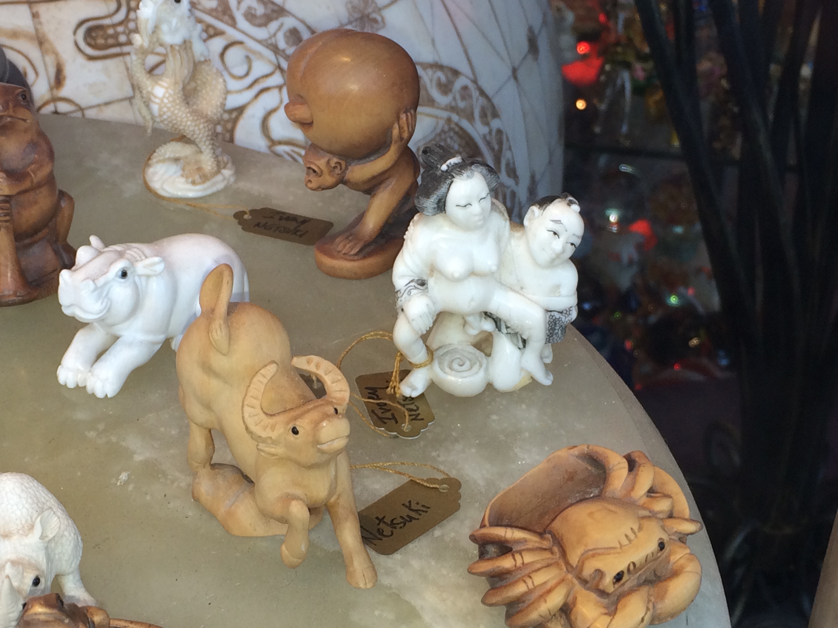In a Sausalito store window (same town with the Merman in another store's window) there were two, huge, carved, mammoth tusks in the window and these cleverly posed ivory figures on a table.  There were at least a dozen different poses.  Each cost $2,400.