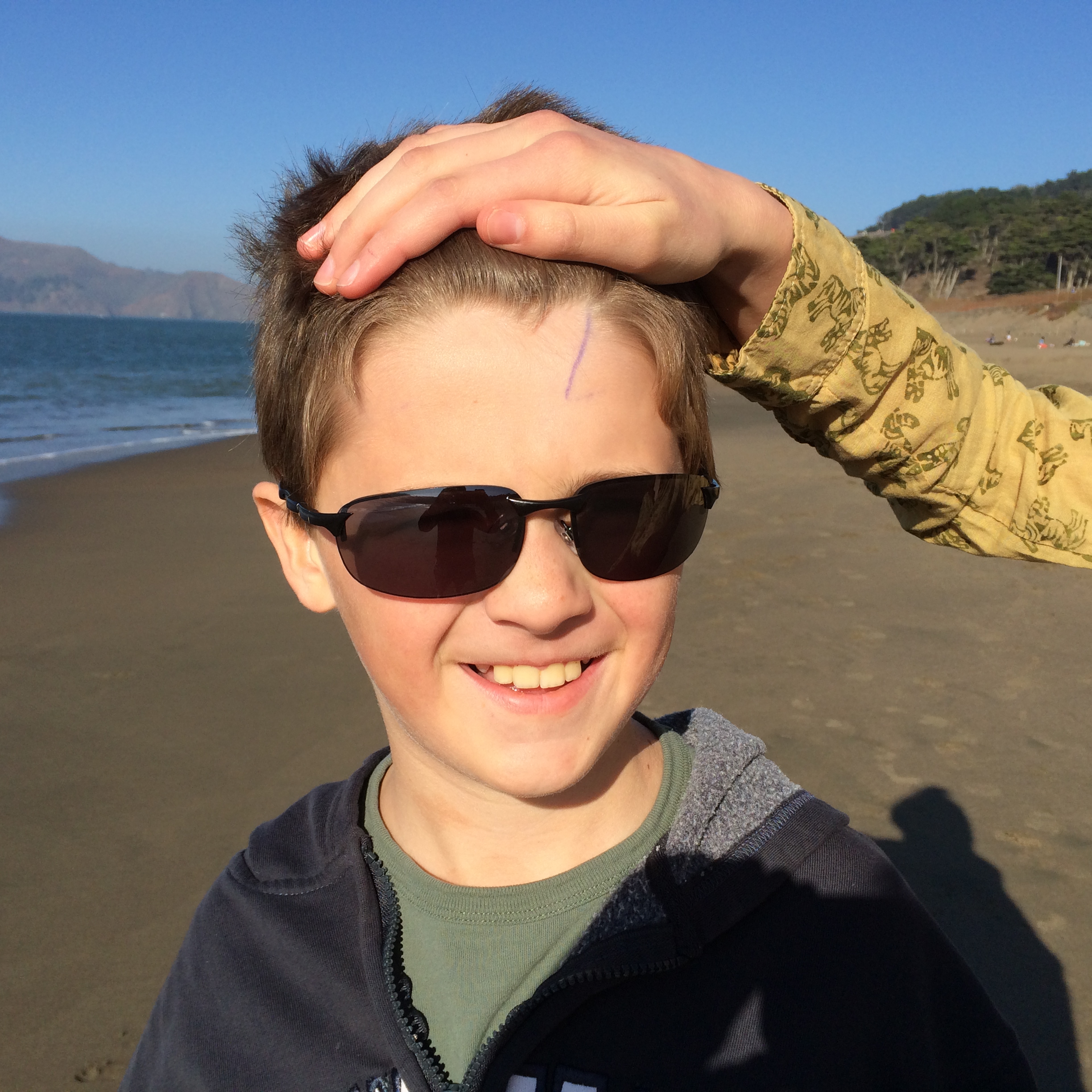 Charlie has completed a children’s crossword puzzle book and a maze book since we’ve been in San Francisco, but he has to be constantly monitored when using a pen. A few days ago he decided scratching his forehead with the pen was a good idea.
