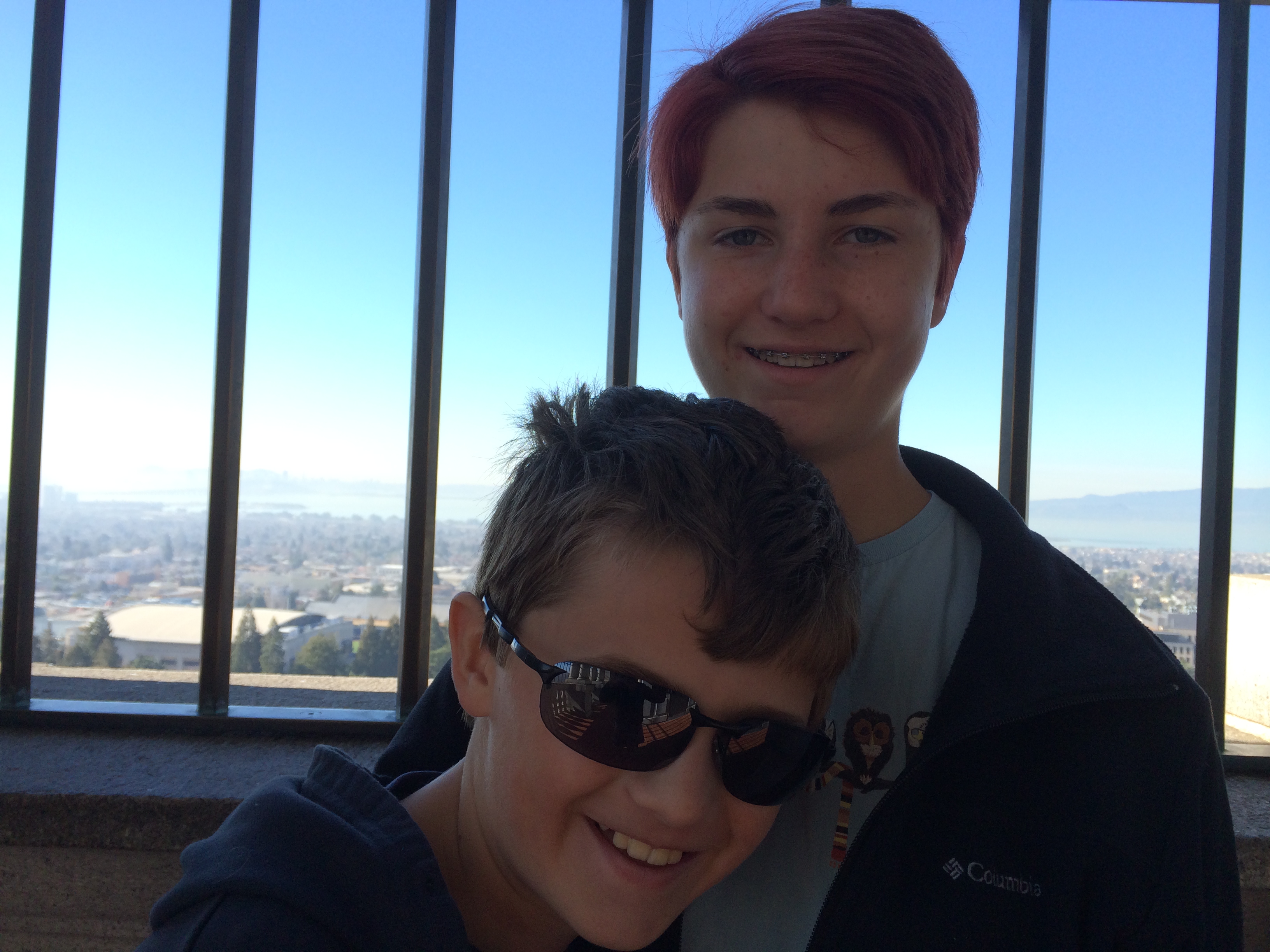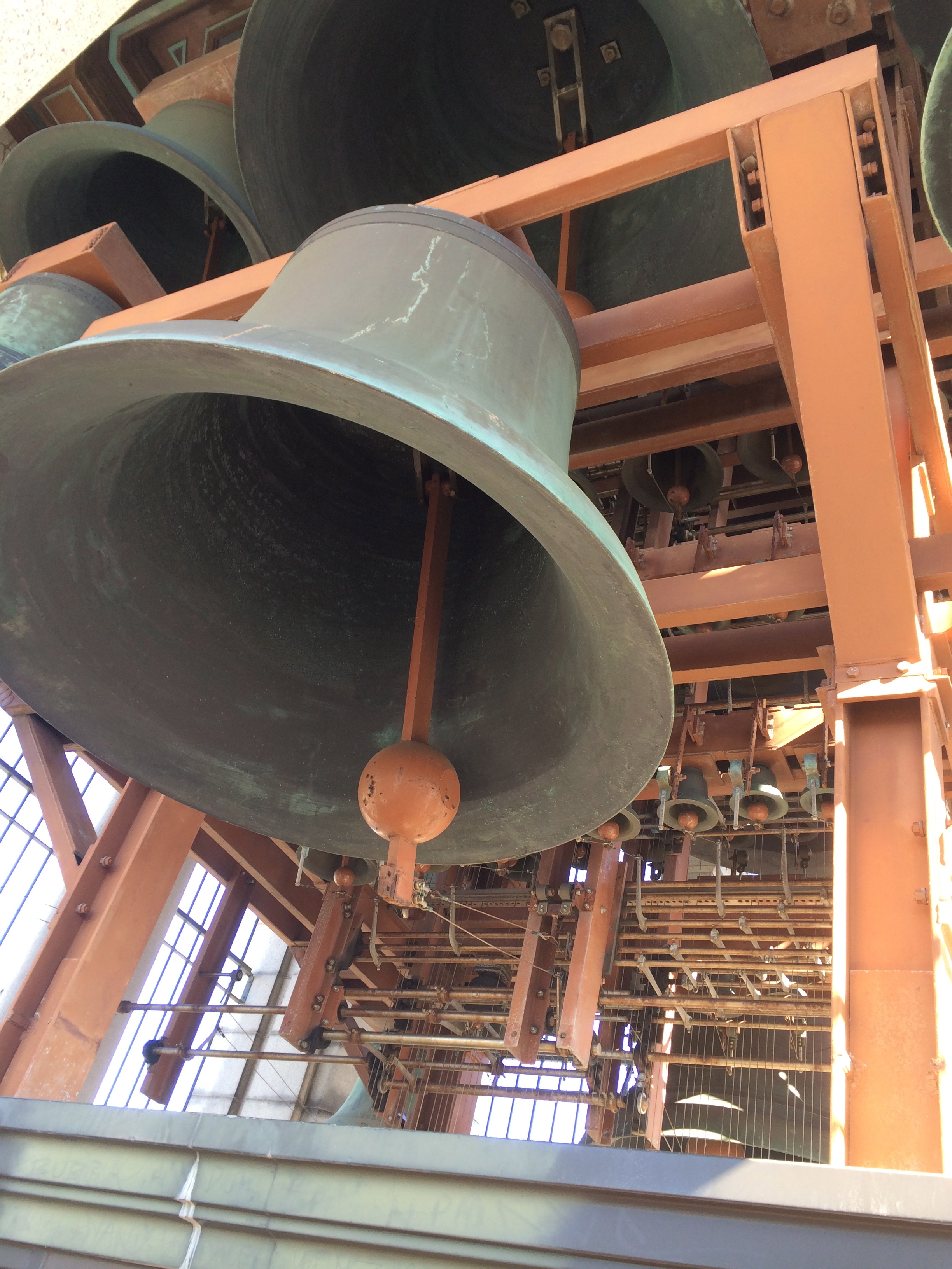 The college students returned to campus this week, so we did, too. Charlie has been wanting to go up in Sather Tower, a campanile (bell and clock tower); but it’s mostly only open when school is in session. It costs a couple dollars per person to go up to the observation deck at 200 feet; the top of the tower is 307 feet. From the deck we could see out to the Bay Bridge and the Golden Gate Bridge, downtown Oakland, downtown San Francisco, and all over Berkeley. The bells are played for ten minutes, three times per day. We knew that one of those times was noon so we planned accordingly so that we could hear them. We thought that standing right by the bells would be too loud, but most of the really large bells weren’t played – just the smaller interior bells. Berkeley students can learn how to play the keyboard that operates the bells, but the musician today was an older man. He’s inside a glass room on the observation deck and sits at a kind of piano. The keys are wooden planks that he lightly hits with his fists, and there are a number of foot pedals that he has to slide around on the bench to get to. These keys and pedals are attached to strings that ring the bells. It was really neat to listen to and watch. There were about 20 people up there with us.