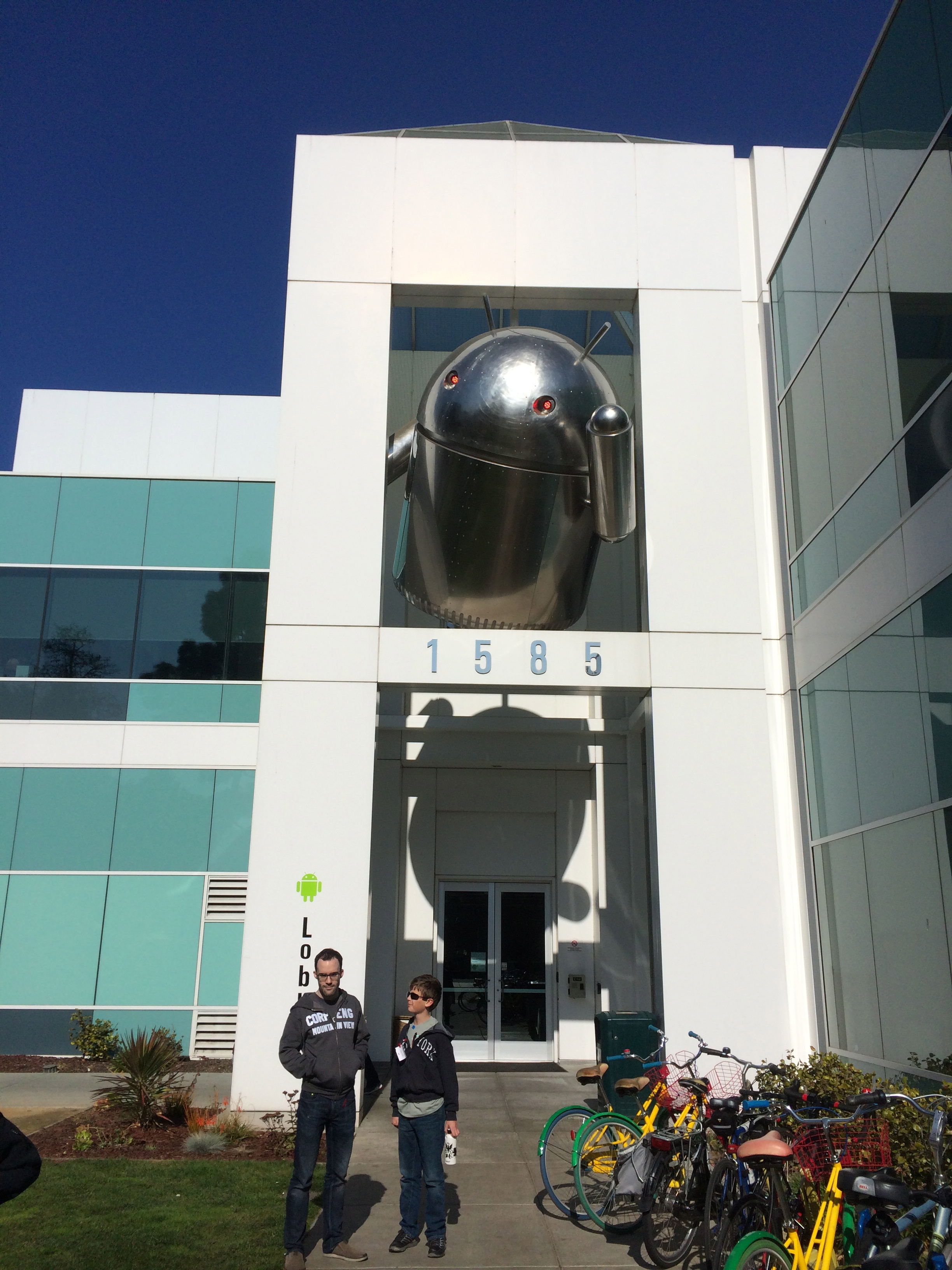 For several years Fortune Magazine has rated Google number one in its listing of Best Companies to Work For, and we saw why today. The HUGE campus features all kinds of services, speakers, movies, and fun activities for its employees. We felt very fortunate that we were able to tour it. Google has solar panels on many of its buildings and carports – a solar installation that was the largest one in the US until recently. Dillon said that Google is a carbon-neutral company and even brings in goats to graze on the grass instead of using a lawn mower. When I bought a Chrome-logo t-shirt for Laurel in the gift shop, I noticed it’s made by American Apparel, not sweatshop labor. Their food offerings at the cafeterias are also enviro-friendly. When I noticed items such as “free-range eggs” on the digital menu overhead and commented on it, Dillon replied, “Yeah, they’re buzzword compliant.” 🙂