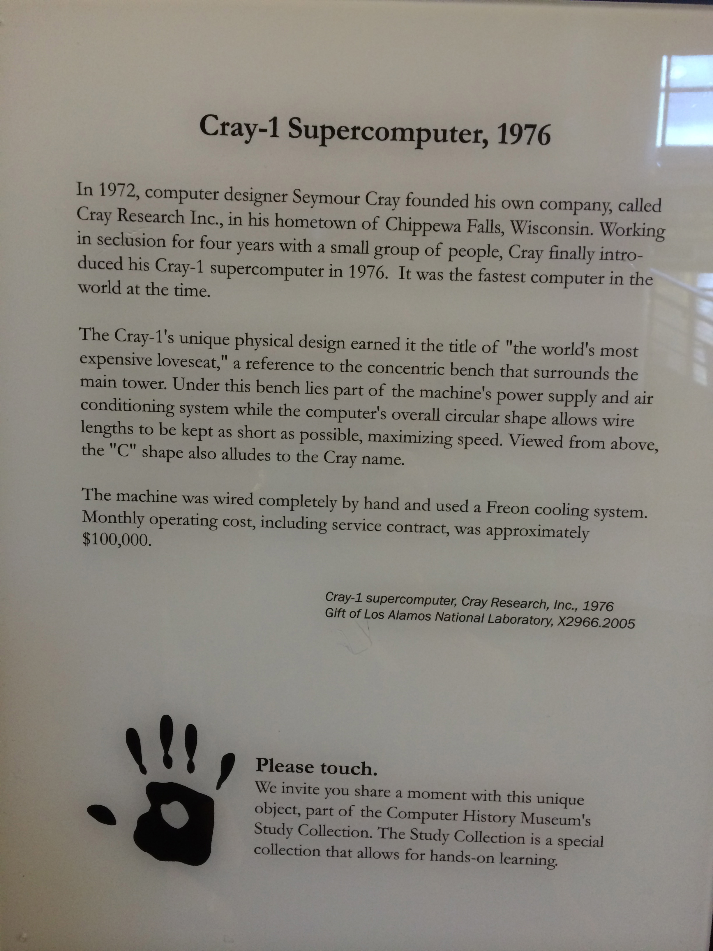 We took a half-hour bus ride to the Caltrain station this morning and then a 42-minute, express train to Mountain View before getting on a free (Google-sponsored) shuttle bus for a few minutes and arriving at the Computer History Museum. The exhibits are really neat and include not only a UNIVAC and an ENIAC but simple – and really complex – mechanical, calculating tools from centuries past. There was an abacus on display with instructions and sample addition problems which we did together. The most complex and fascinating of the mechanical calculators was Babbage’s Difference Engine. Here’s a YouTube video showing it.