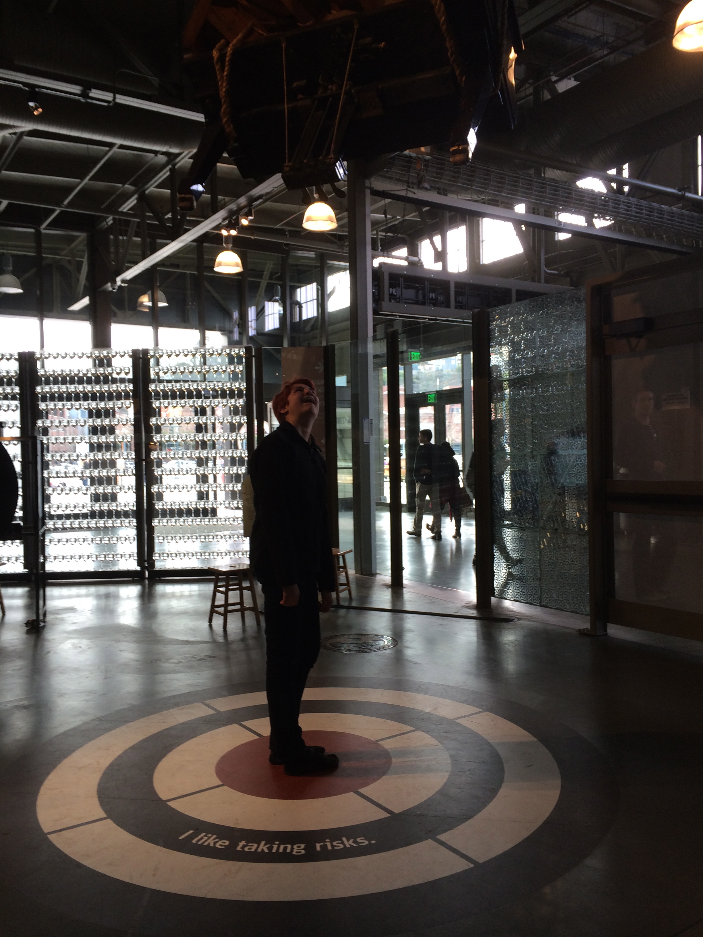 Also at the Exploratorium – there’s a piano suspended from the ceiling above Laurel’s head.