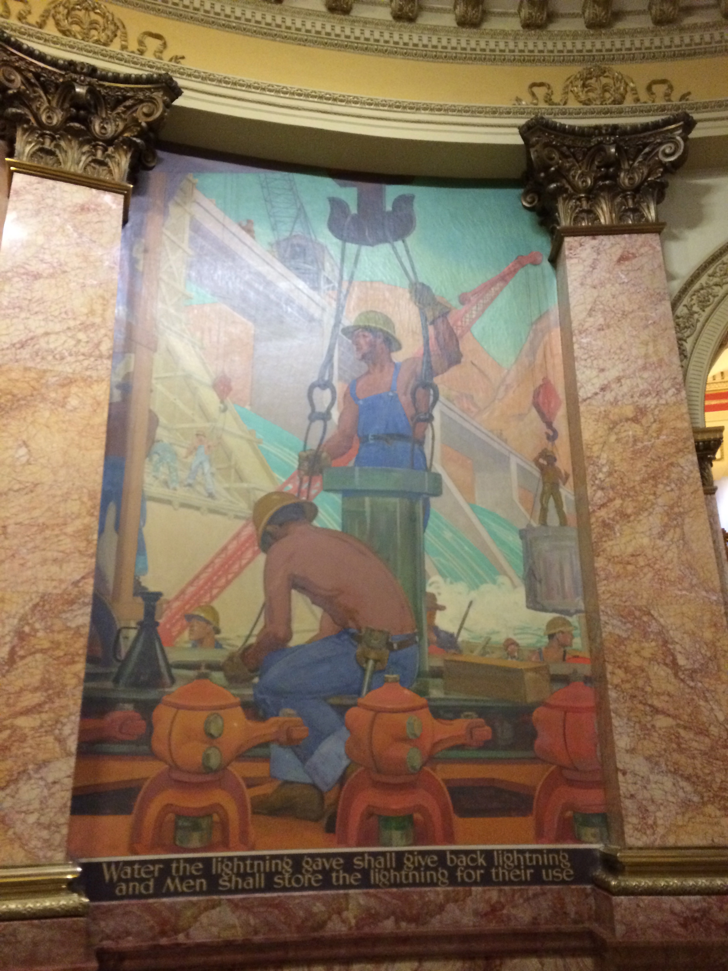 • Since we and the security guards were about the only people at the capitol yesterday, the kids and I sat on the marble staircase by the murals to look up info on my phone about the artist. I read about True, the artist, but I didn’t see any commentary about others’ agreeing with me that these are some goofy pieces. I guess I (and Laurel) just don’t have sophisticated artistic and poetic taste. We read that True first painted murals for the Wyoming state capitol and later for the Missouri state capitol. I speculated that maybe True’s portfolio was just one set of capitol murals that he painted in each state that hired him. 🙂