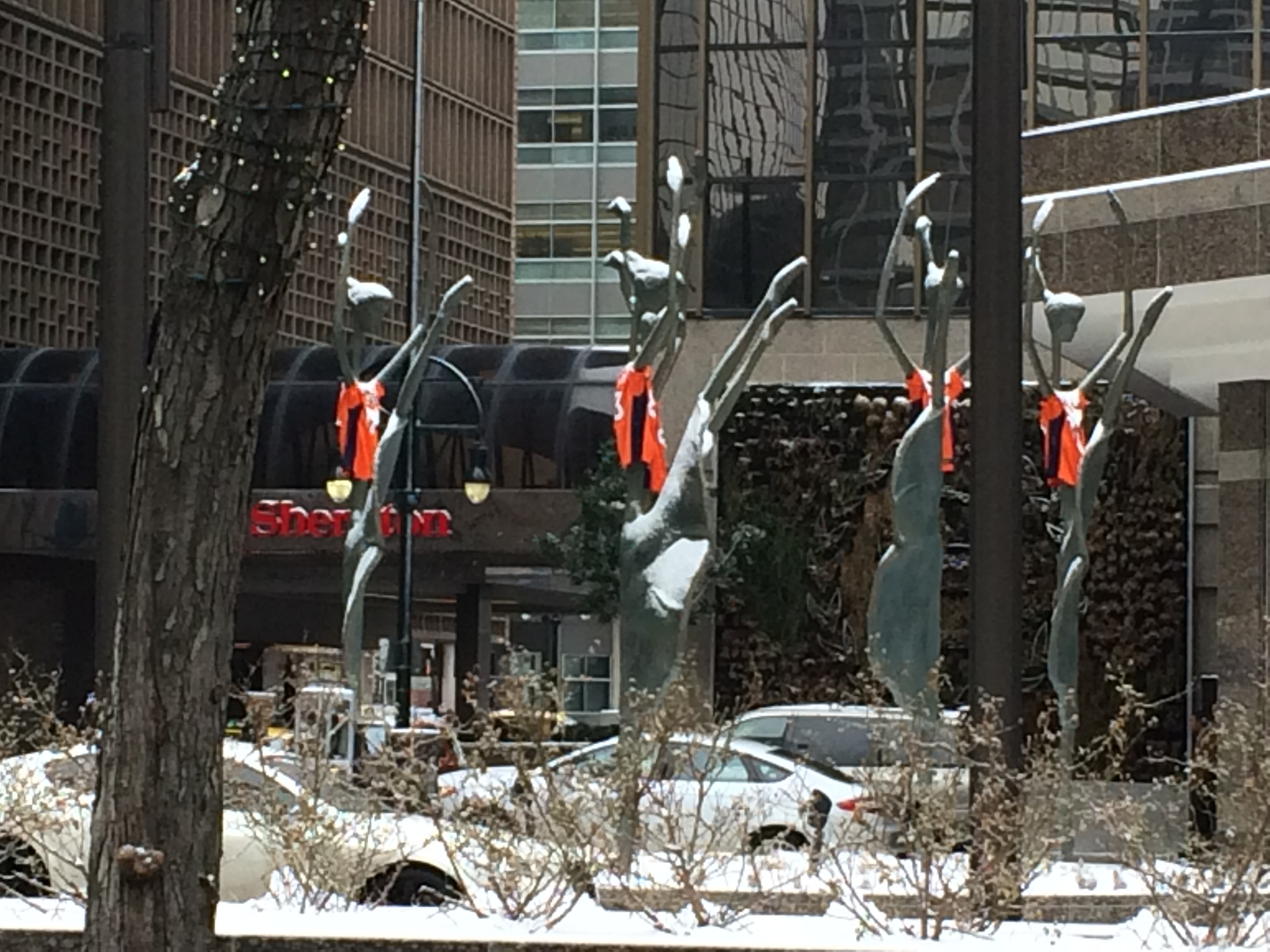 We arrived just in time for Bronco fever. 🙂 Here the ballet dancer statues outside the Sheraton on 16th Street sport Broncos jerseys.