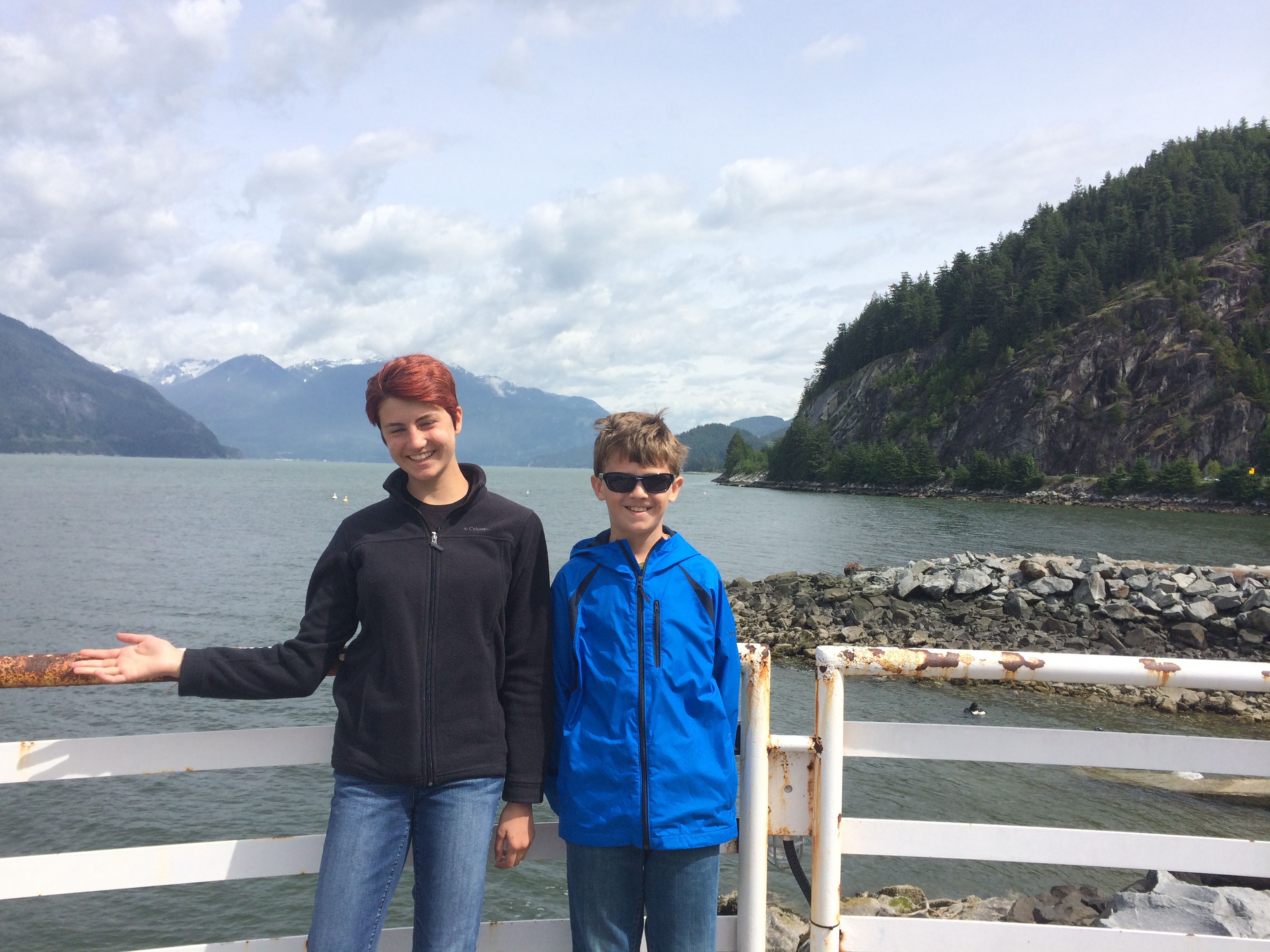 Our taxi driver pulled over in a parking lot near the Sea to Sky Highway on the way home Whistler on June 8, so we could take some pictures. We climbed some stairs to go out on this ledge and get some good scenery shots. Laurel is trying to cover up the rusty railing.