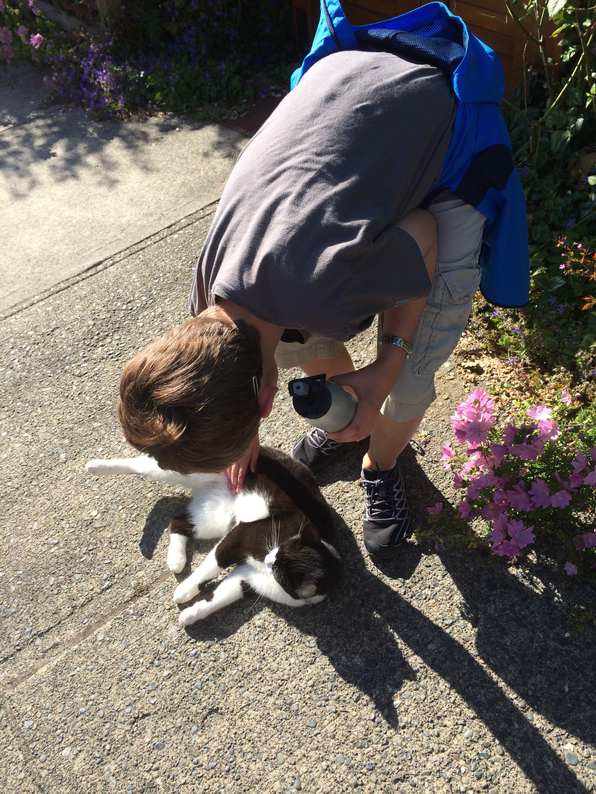 Charlie encountered yet another friendly cat. This one wanted its belly rubbed.