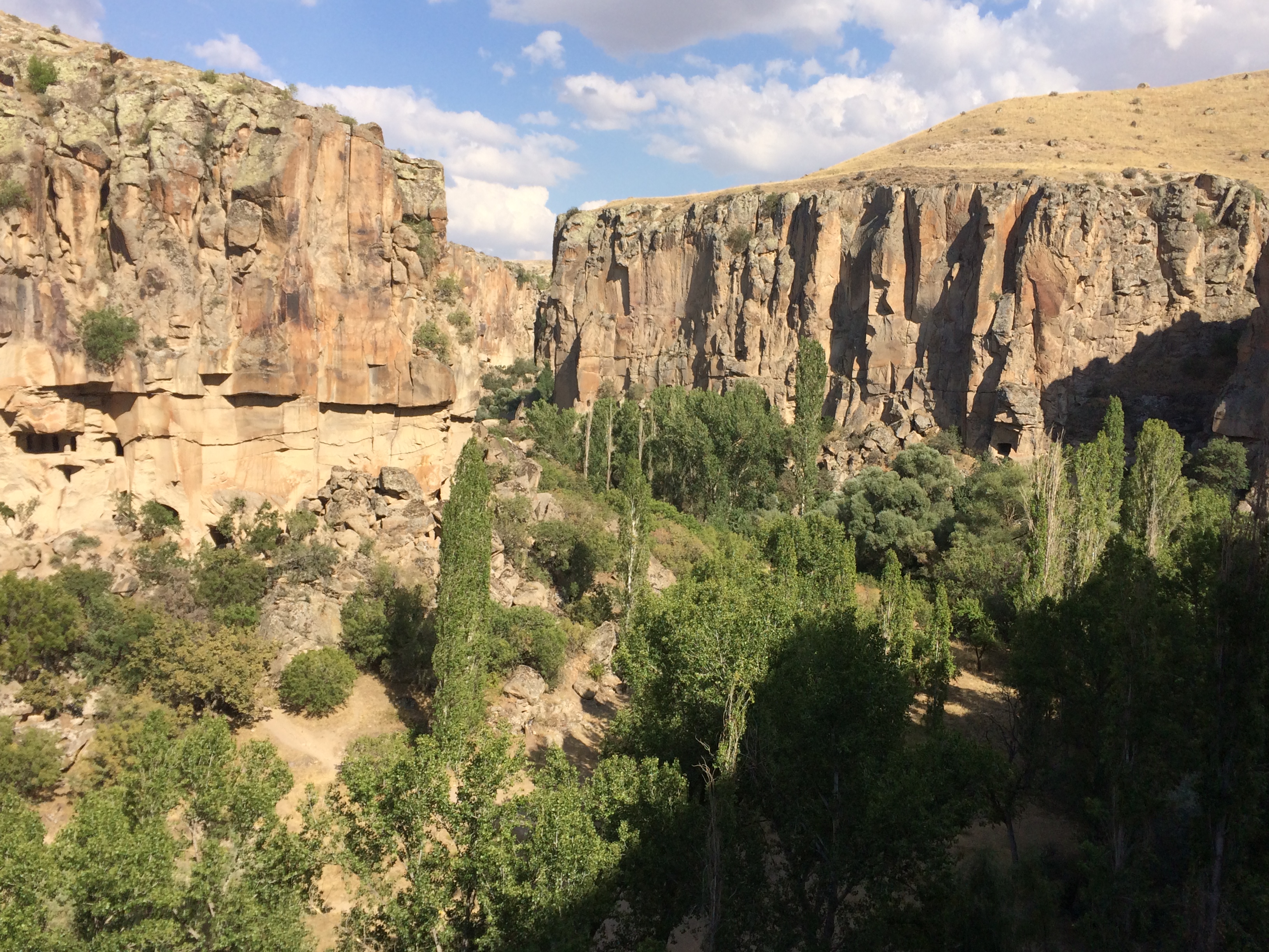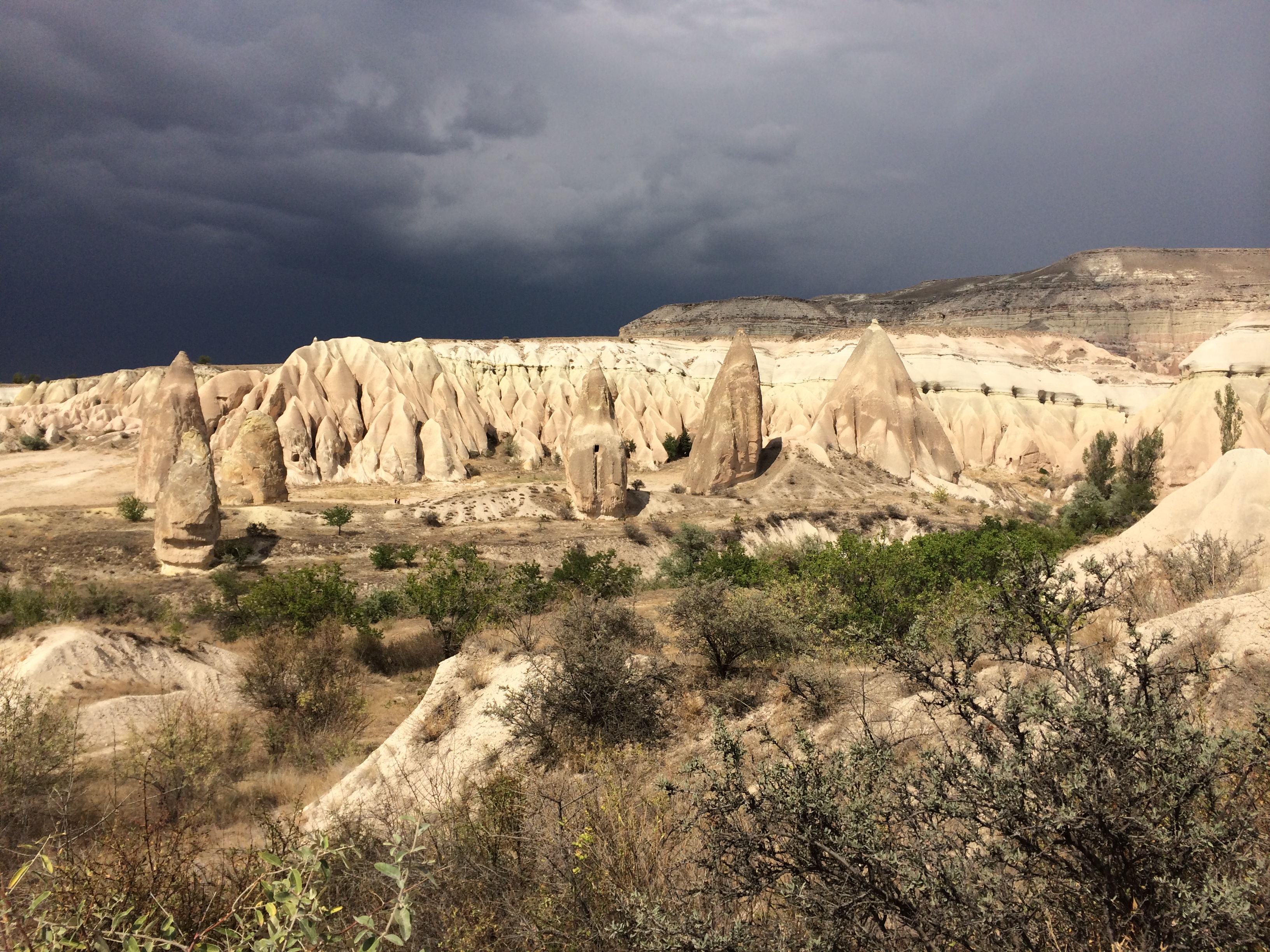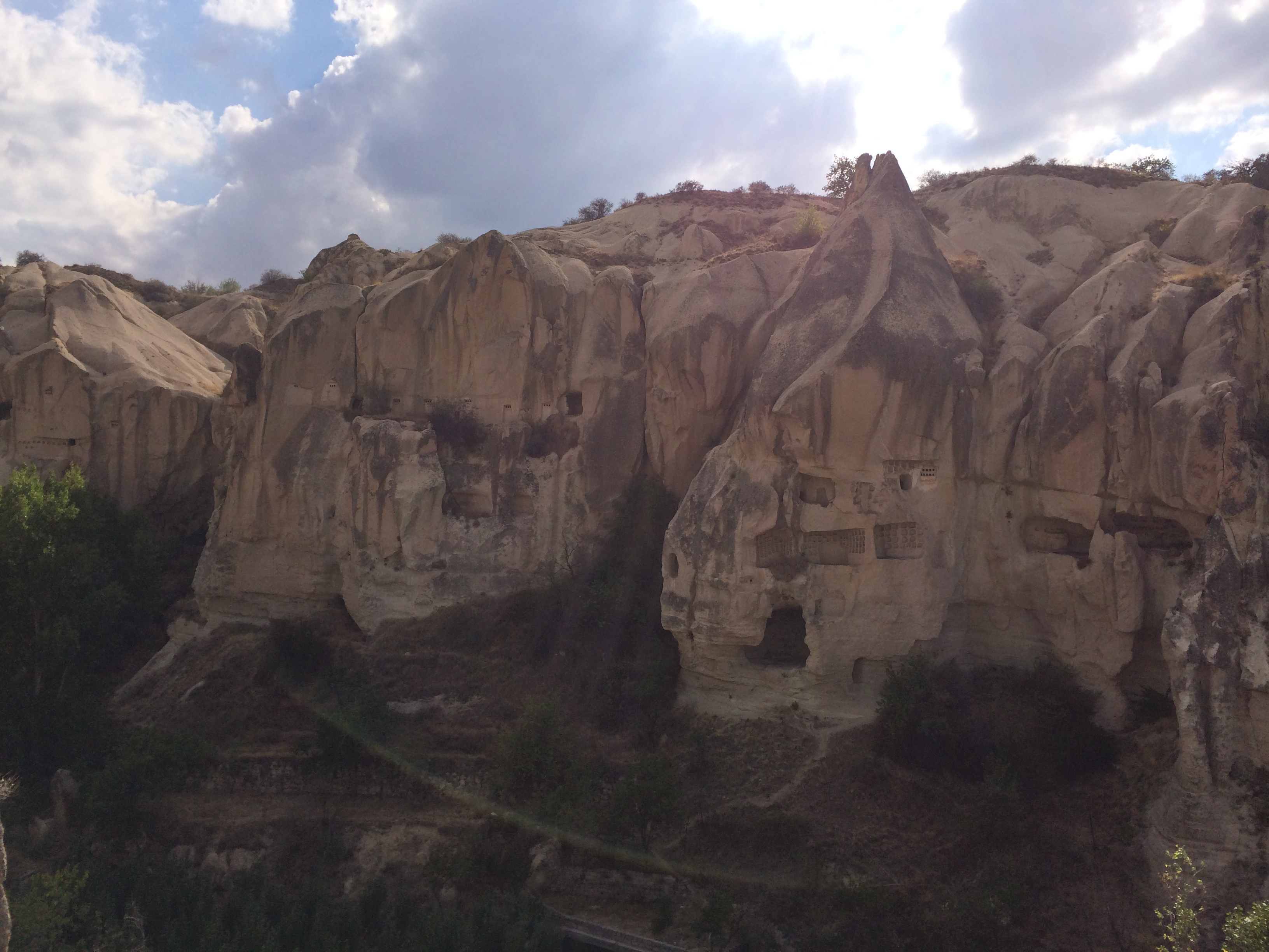 After Kaymakli, our taxi driver, Bakir, drove us to the Ihlara Valley where we ate lunch and then went on a hike in a canyon along a river. Bakir drove to the next town and waited for us. It’s a beautiful walk, popular with international tourists, where we could walk up long staircases on both sides of the river and see thousand-year-old Byzantine churches that had been carved into the rock. There are frescoes all over the ceilings and walls although most are very damaged by both natural and human causes. Nearly all the faces – of Jesus and the saints – had been destroyed by shepherd boys centuries ago, heeding the Muslim teaching to avoid graven images. There are loads of these churches on the 2-mile walk. There are signs in Turkish and English at each church explaining the architecture and estimating the date it was built. What we couldn’t figure out was why they needed so many churches. I’ll have to research that a bit more. We also don’t know where people lived who went to these churches. IMG_3509 IMG_3510 IMG_3512 IMG_3519 IMG_3522 IMG_3526 IMG_3528 IMG_3537 IMG_3553 IMG_3534 On Tuesday we went to the Göreme Open-Air Museum which is similar to what we saw in the Ihlara Valley – lotsa churches clustered together. IMG_3574 IMG_3575 IMG_3577 Yesterday we hiked through the stunning Rose Valley. There were many points along the trail where the paths diverged, but only one trail was marked, so we assumed, correctly, that that was the trail we should take. A thunderstorm started while we hiked – at the top of the cliff with no shelter in sight – but we didn’t get struck. Yay! A couple Chinese teenage boys waved us down as we walked further down in the valley. They had gotten their small, rented ATV stuck between the cliff wall and a rock. We (mostly Laurel) helped free the vehicle, and they were very grateful. There don’t seem to be any decent maps of this area. As far as I can tell, some streets don’t have names; and no local maps that our hotel staff gave us have any distance markings on them and are not to scale. When we asked the Chinese boys if they knew how far it was to Çavusin where we hoped we were heading, they pulled out a lovely color map for us to look at; but it also had no detail on it. We made it to Çavusin – yay again! – and called our hotel to call a taxi to pick us up. IMG_3591 IMG_3597 IMG_3603 IMG_3609 IMG_3610 IMG_3588 IMG_3612