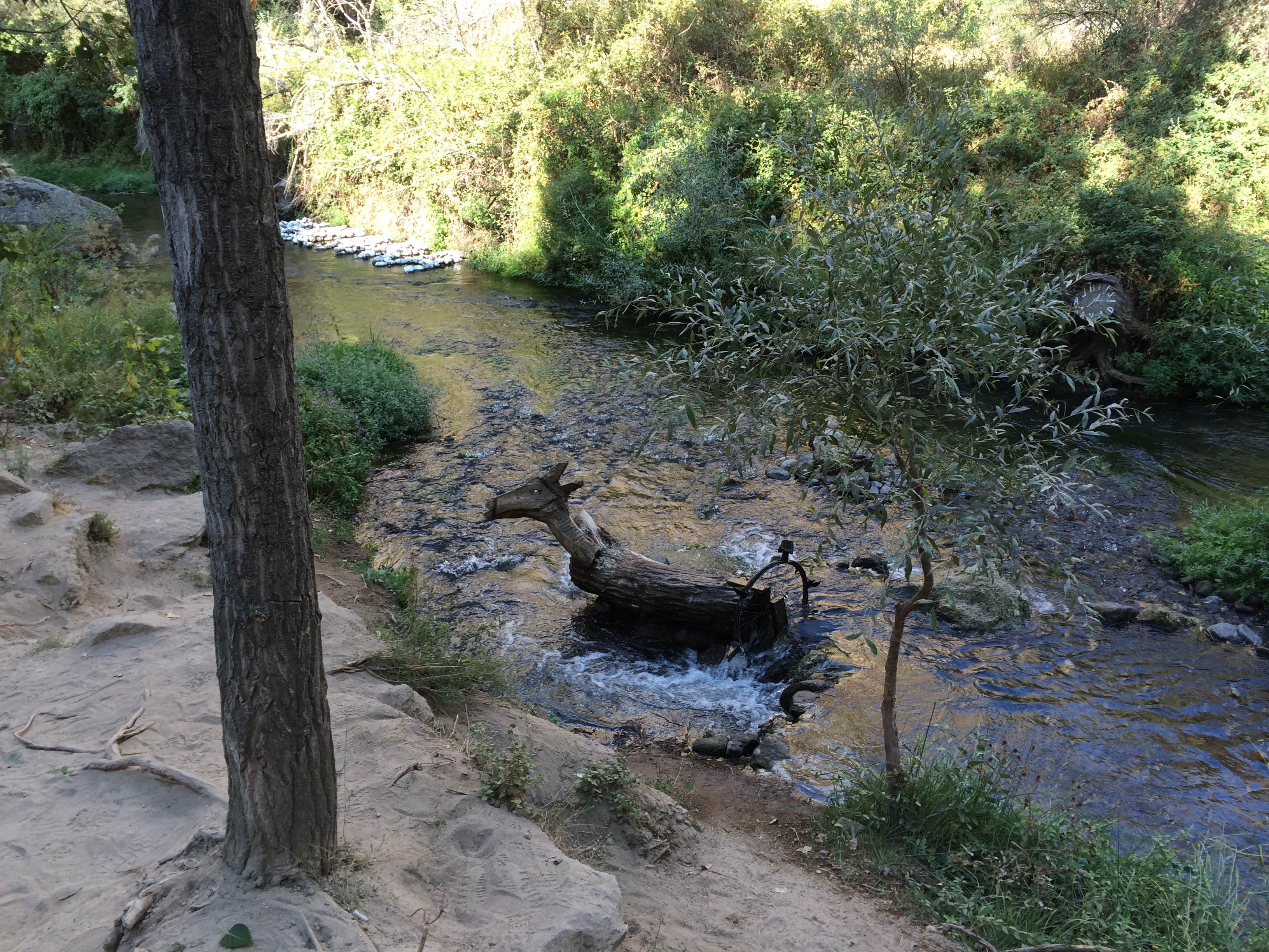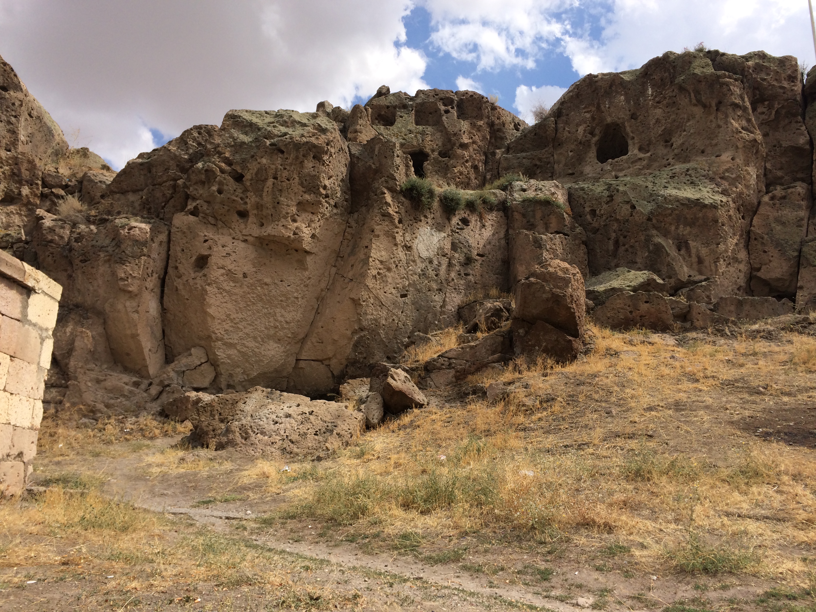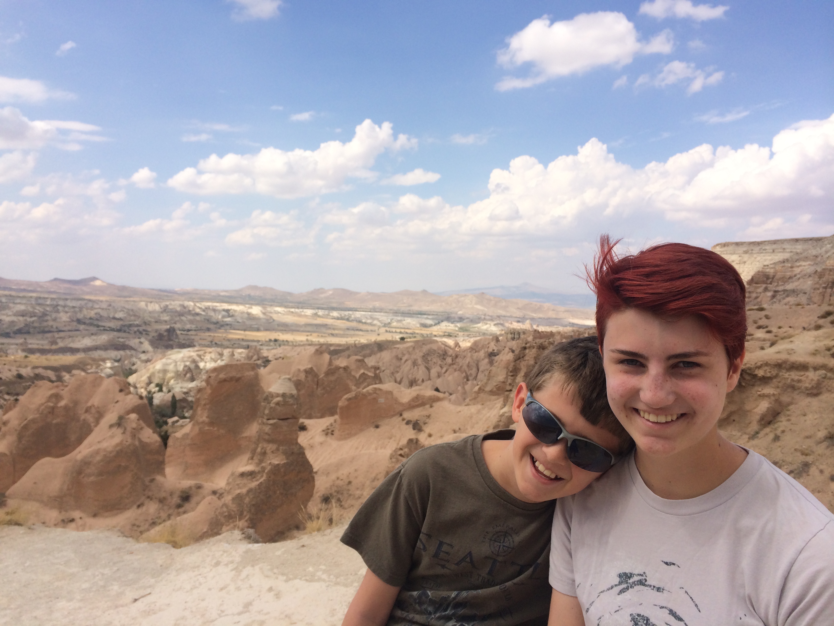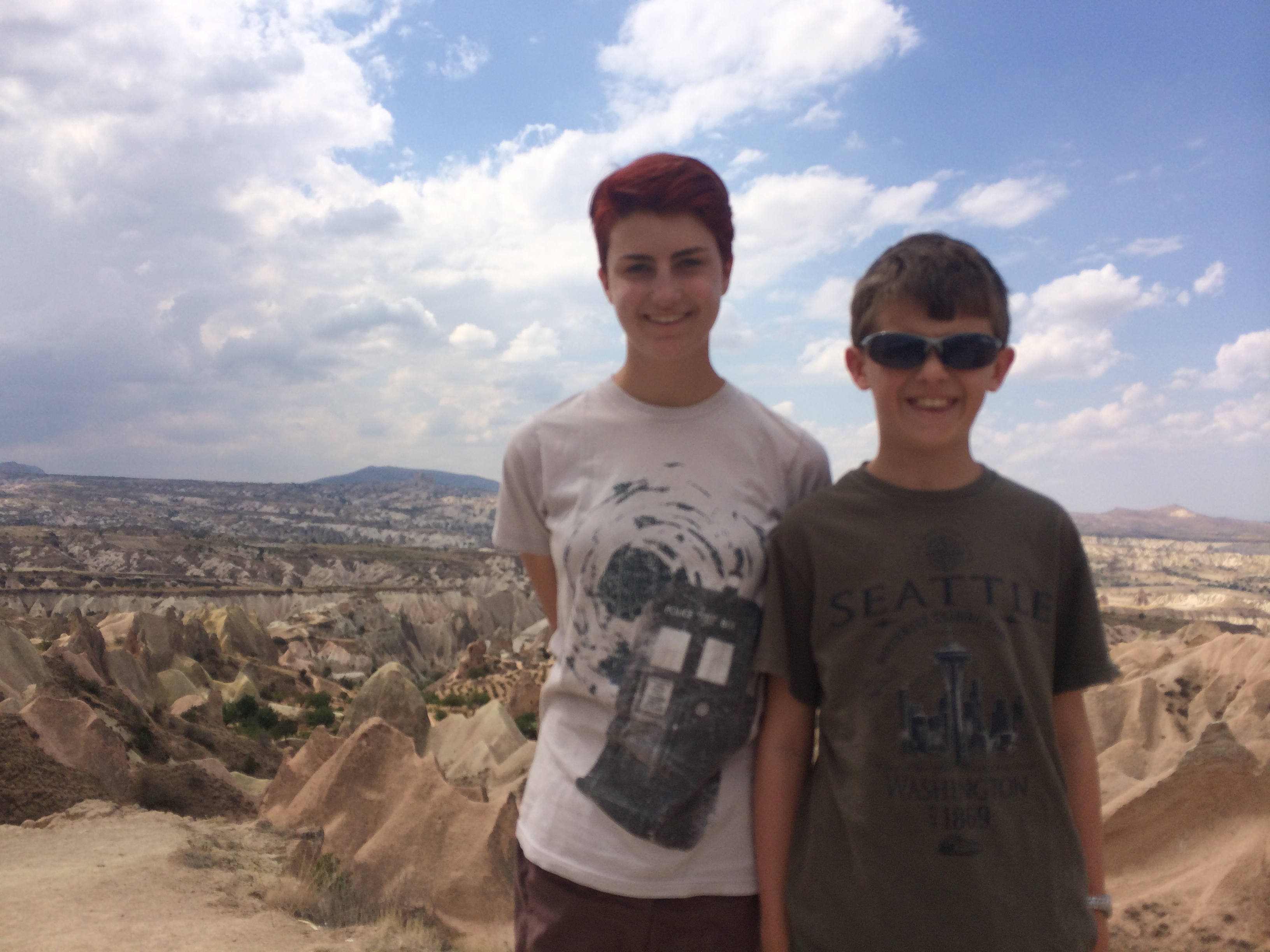 After Kaymakli, our taxi driver, Bakir, drove us to the Ihlara Valley where we ate lunch and then went on a hike in a canyon along a river. Bakir drove to the next town and waited for us. It’s a beautiful walk, popular with international tourists, where we could walk up long staircases on both sides of the river and see thousand-year-old Byzantine churches that had been carved into the rock. There are frescoes all over the ceilings and walls although most are very damaged by both natural and human causes. Nearly all the faces – of Jesus and the saints – had been destroyed by shepherd boys centuries ago, heeding the Muslim teaching to avoid graven images. There are loads of these churches on the 2-mile walk. There are signs in Turkish and English at each church explaining the architecture and estimating the date it was built. What we couldn’t figure out was why they needed so many churches. I’ll have to research that a bit more. We also don’t know where people lived who went to these churches. IMG_3509 IMG_3510 IMG_3512 IMG_3519 IMG_3522 IMG_3526 IMG_3528 IMG_3537 IMG_3553 IMG_3534 On Tuesday we went to the Göreme Open-Air Museum which is similar to what we saw in the Ihlara Valley – lotsa churches clustered together. IMG_3574 IMG_3575 IMG_3577 Yesterday we hiked through the stunning Rose Valley. There were many points along the trail where the paths diverged, but only one trail was marked, so we assumed, correctly, that that was the trail we should take. A thunderstorm started while we hiked – at the top of the cliff with no shelter in sight – but we didn’t get struck. Yay! A couple Chinese teenage boys waved us down as we walked further down in the valley. They had gotten their small, rented ATV stuck between the cliff wall and a rock. We (mostly Laurel) helped free the vehicle, and they were very grateful. There don’t seem to be any decent maps of this area. As far as I can tell, some streets don’t have names; and no local maps that our hotel staff gave us have any distance markings on them and are not to scale. When we asked the Chinese boys if they knew how far it was to Çavusin where we hoped we were heading, they pulled out a lovely color map for us to look at; but it also had no detail on it. We made it to Çavusin – yay again! – and called our hotel to call a taxi to pick us up. IMG_3591 IMG_3597 IMG_3603 IMG_3609 IMG_3610 IMG_3588 IMG_3612
