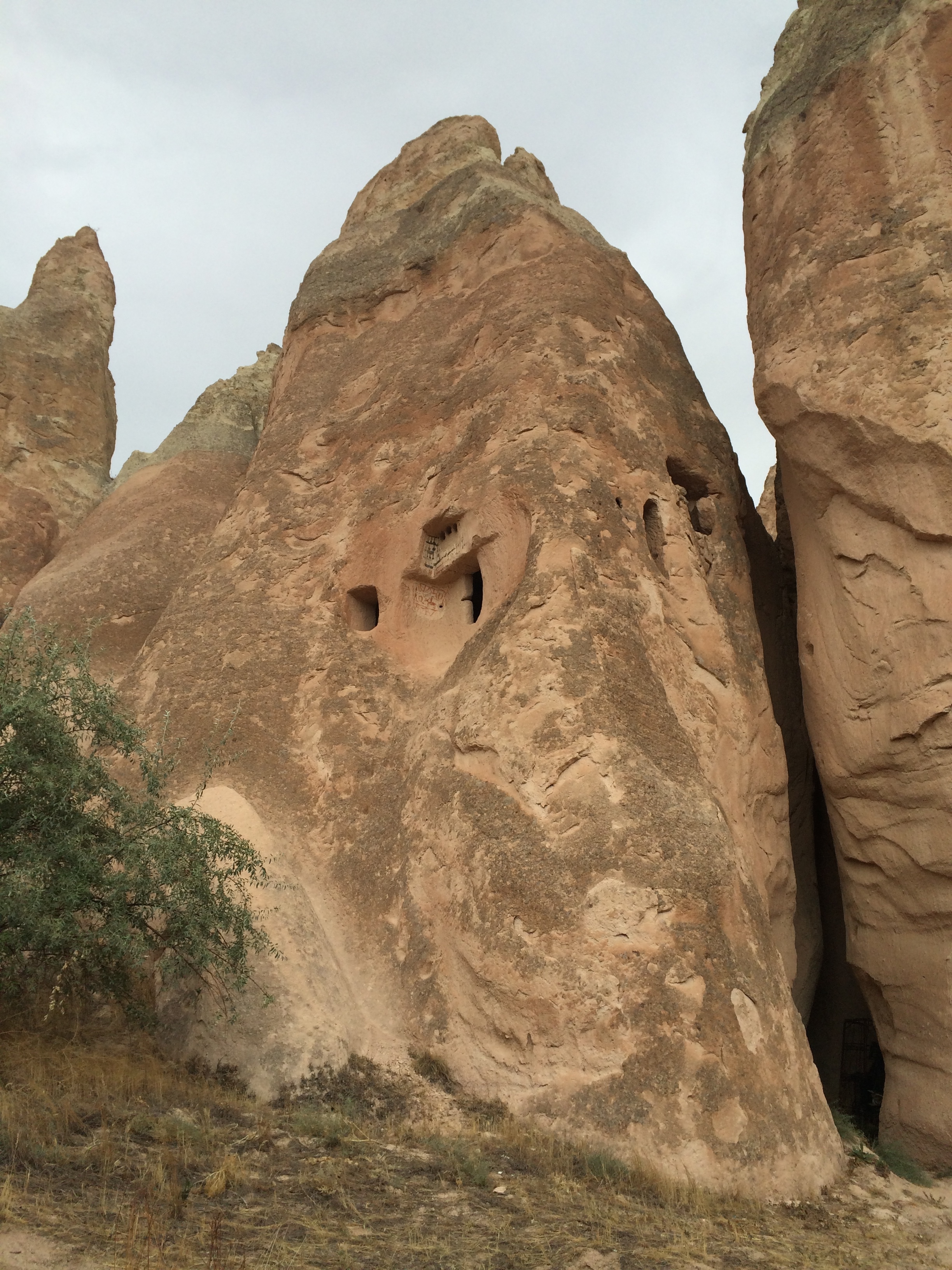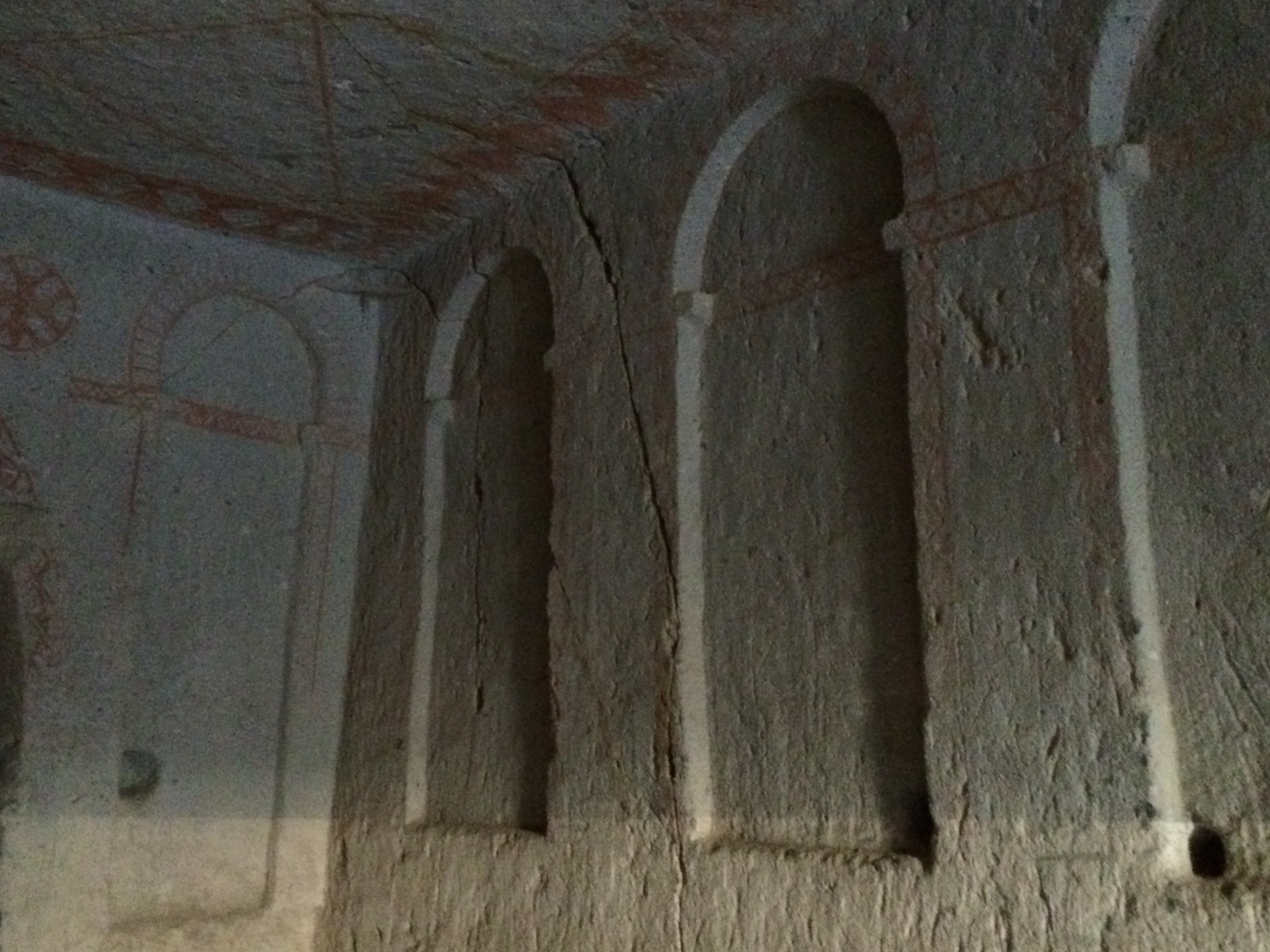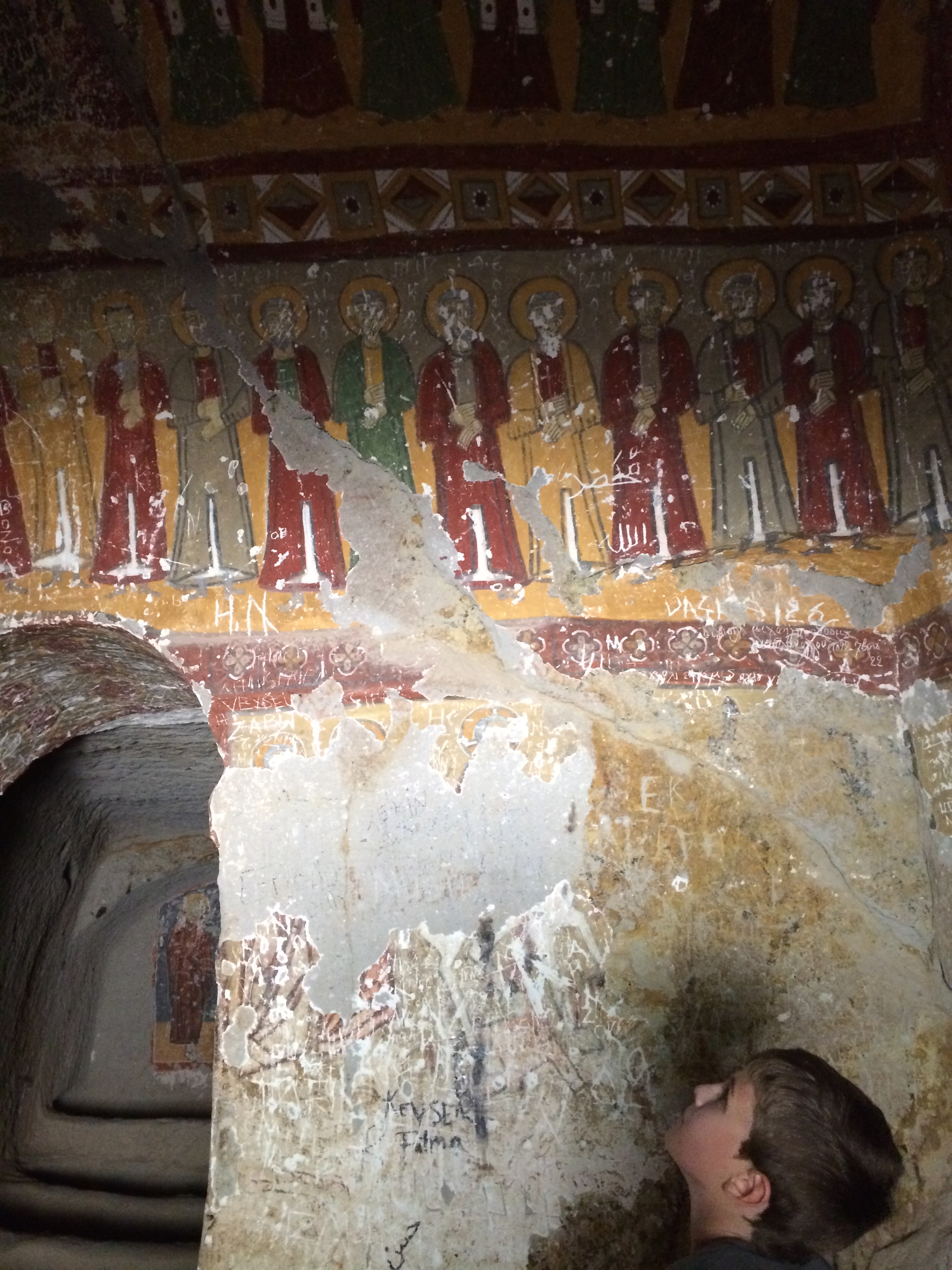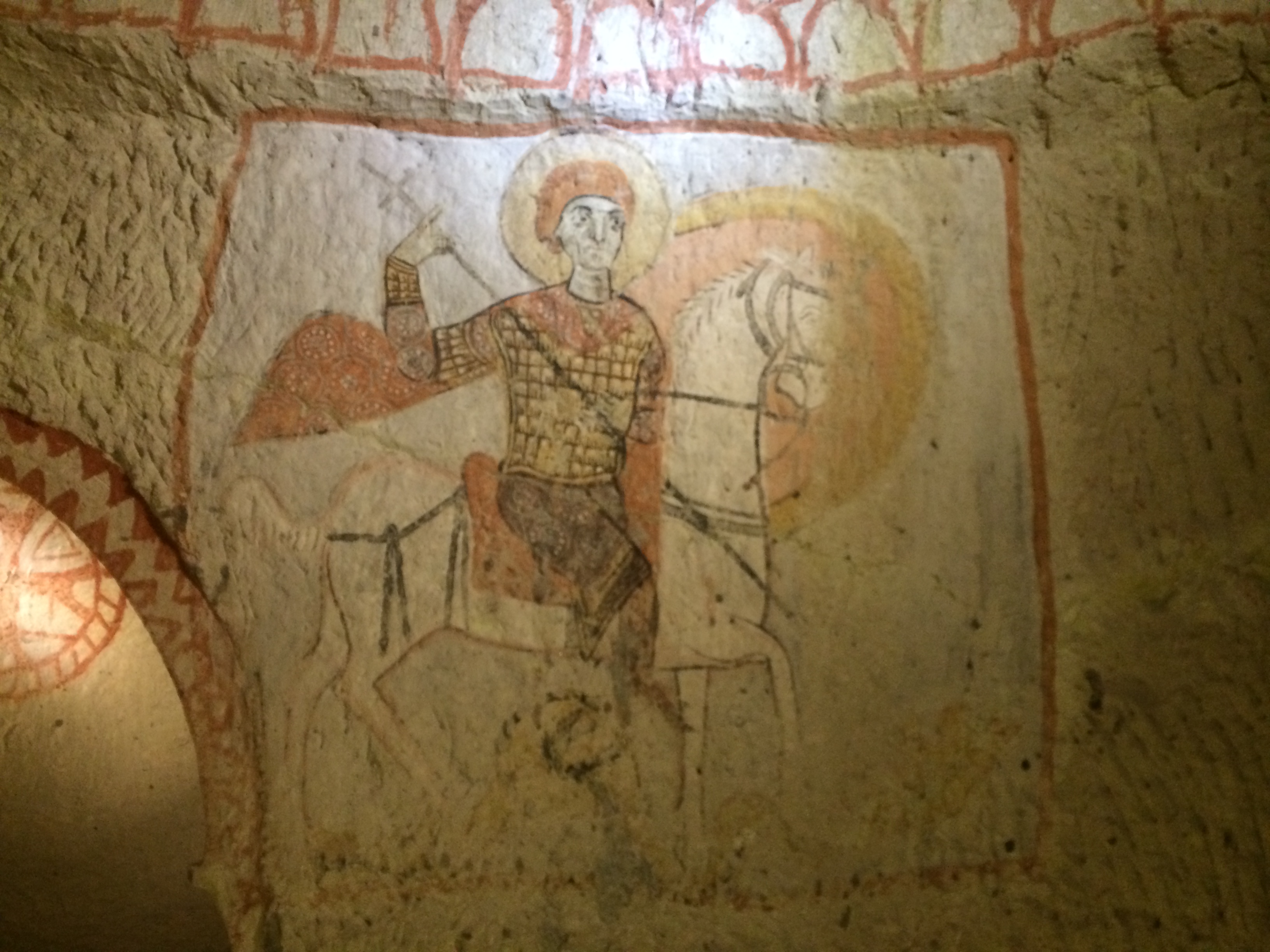 I’m typing this on my phone in our cave suite; we received a free room upgrade a couple days ago. It’s larger, but the 5 am call to prayer is much easier to hear here, and Laurel can’t get back to sleep. The wifi signal is also nearly non-existent from this location. Oh well. On Monday we took a taxi to Kaymakli, one of several nearby underground cities. Before I came to Cappadocia, I thought that early Christians, hiding from and battling Muslims, built these underground cities. I was wrong. Although Christians did eventually live in these underground cities, the Hittites built them many centuries before Jesus’ birth. The one at Kaymakli goes eight stories underground, but only four levels have been excavated. As Laurel, Charlie, and I were walking down the stairs to the cave, a man approached us, offering us his tour-guide services. I declined, and we took a few steps into the busy (lotsa tourists!) labyrinth. He followed us and again offered his services. This time I readily accepted; it seemed everyone else had a personal or group guide. I don’t know how we would have found our way out or known anything about what we were seeing; there were no signs or pamphlets. There were so many large holes in the floor, now covered with grates, that we wondered how any young children survived down there millennia ago. Some of the holes had been carved out of this soft volcanic rock to store and preserve food and allow wine to ferment. Others had been fitted with spikes at the bottom of hidden cave openings to kill animals for food or enemies. Others were used as prisons for miscreants within the cave community. Laurel thought the prisoners’ lives must have been miserable since she guessed that they probably would not have been considered worthy of lighting/burning of oil.