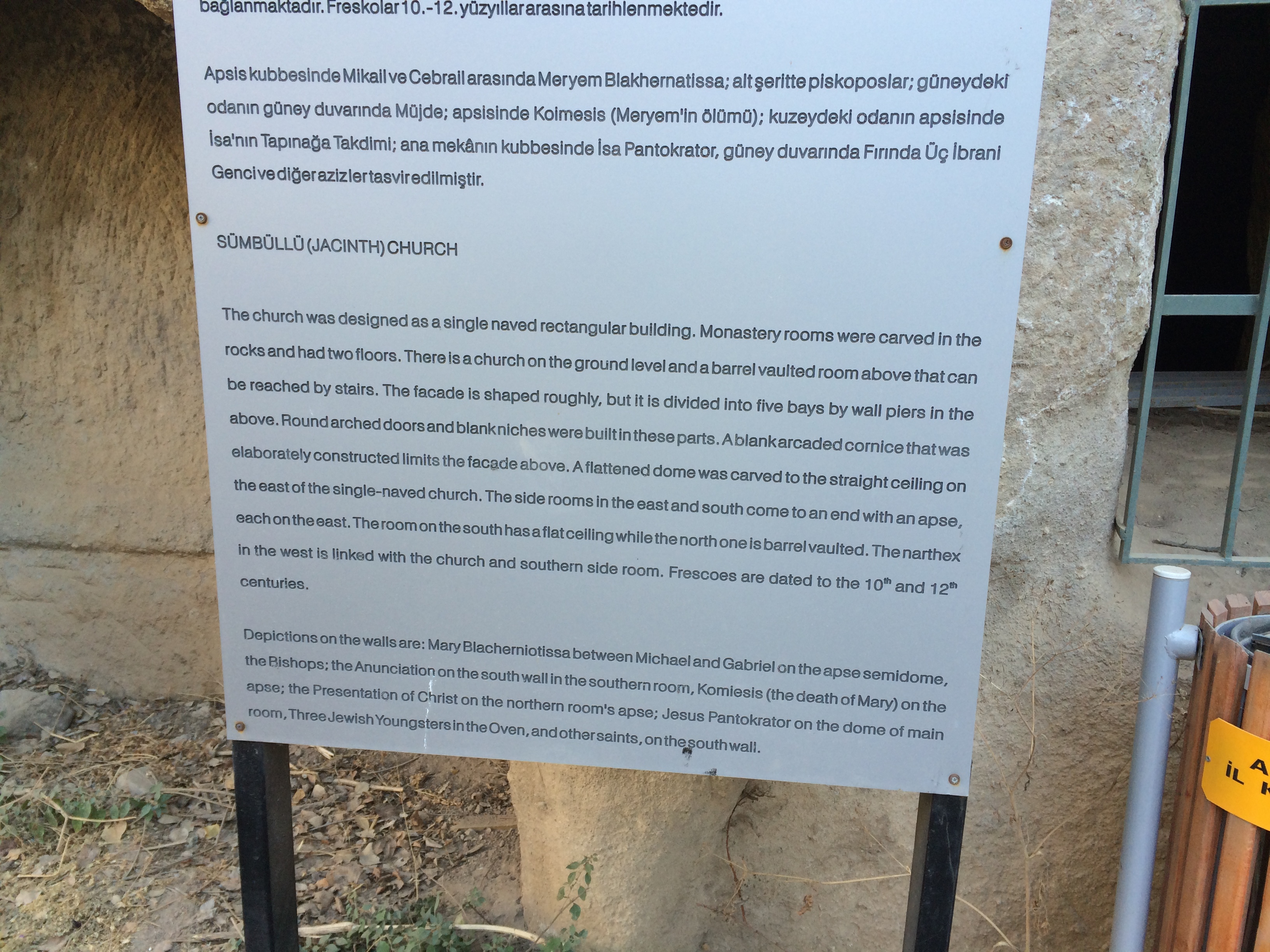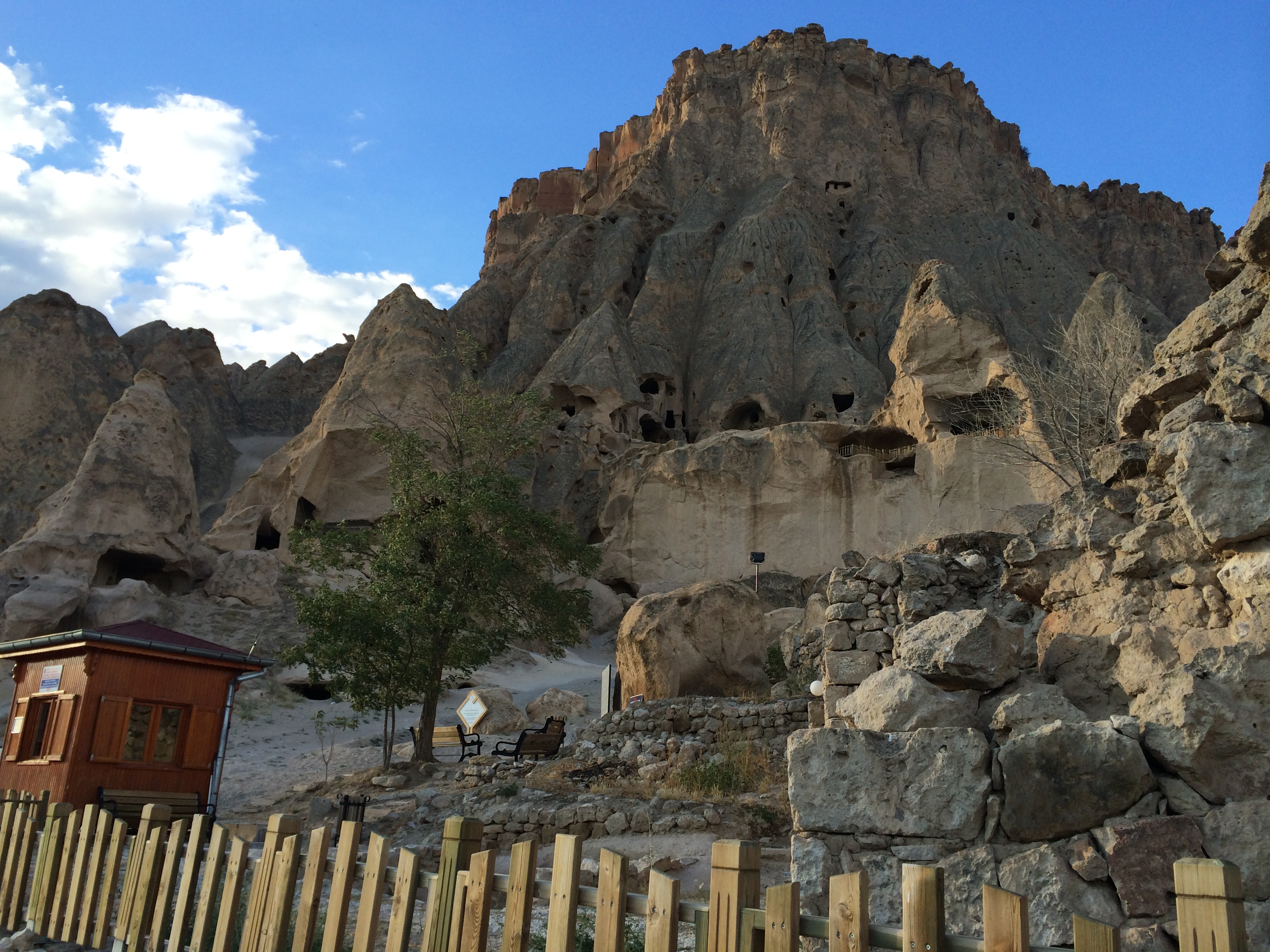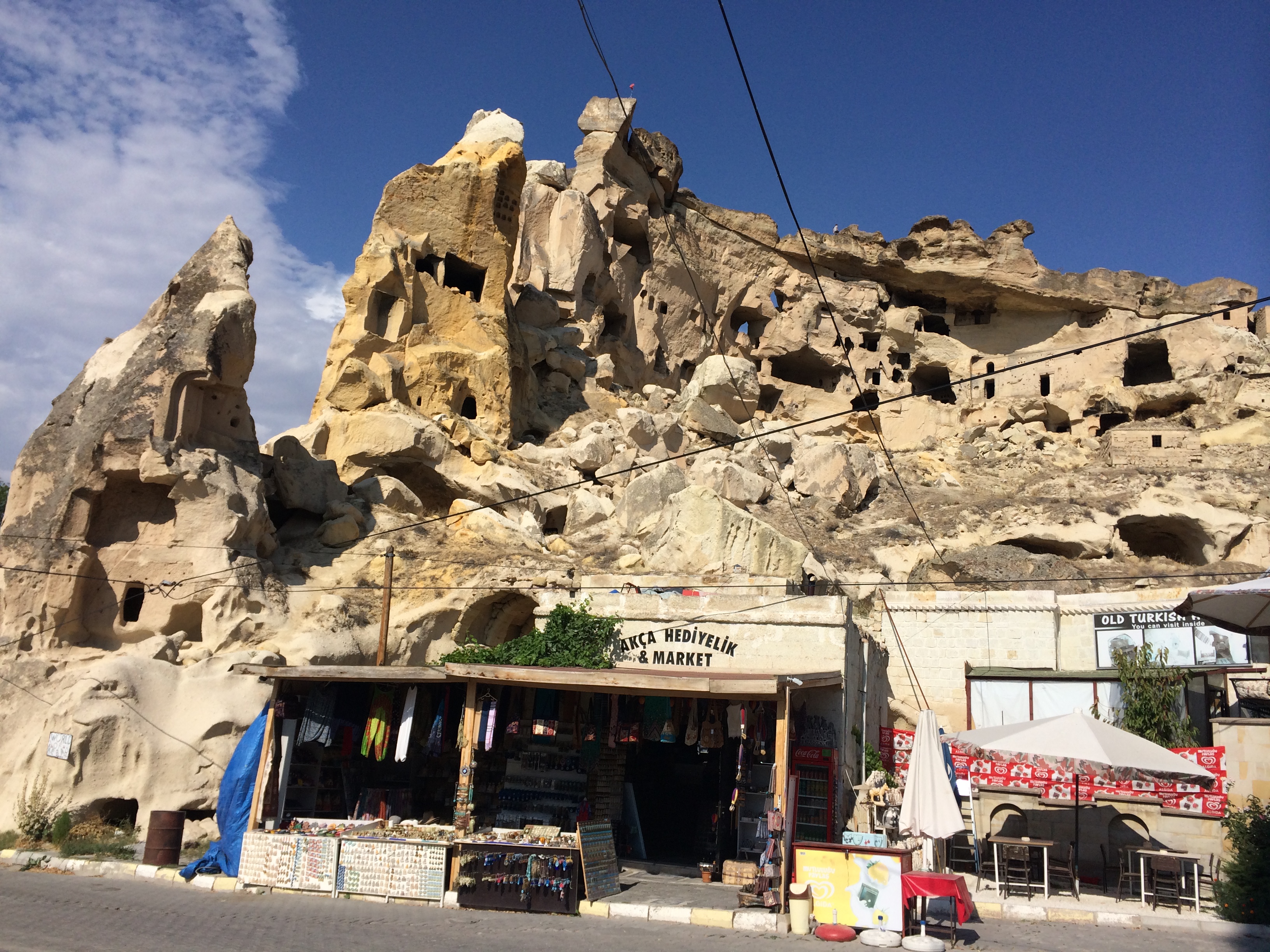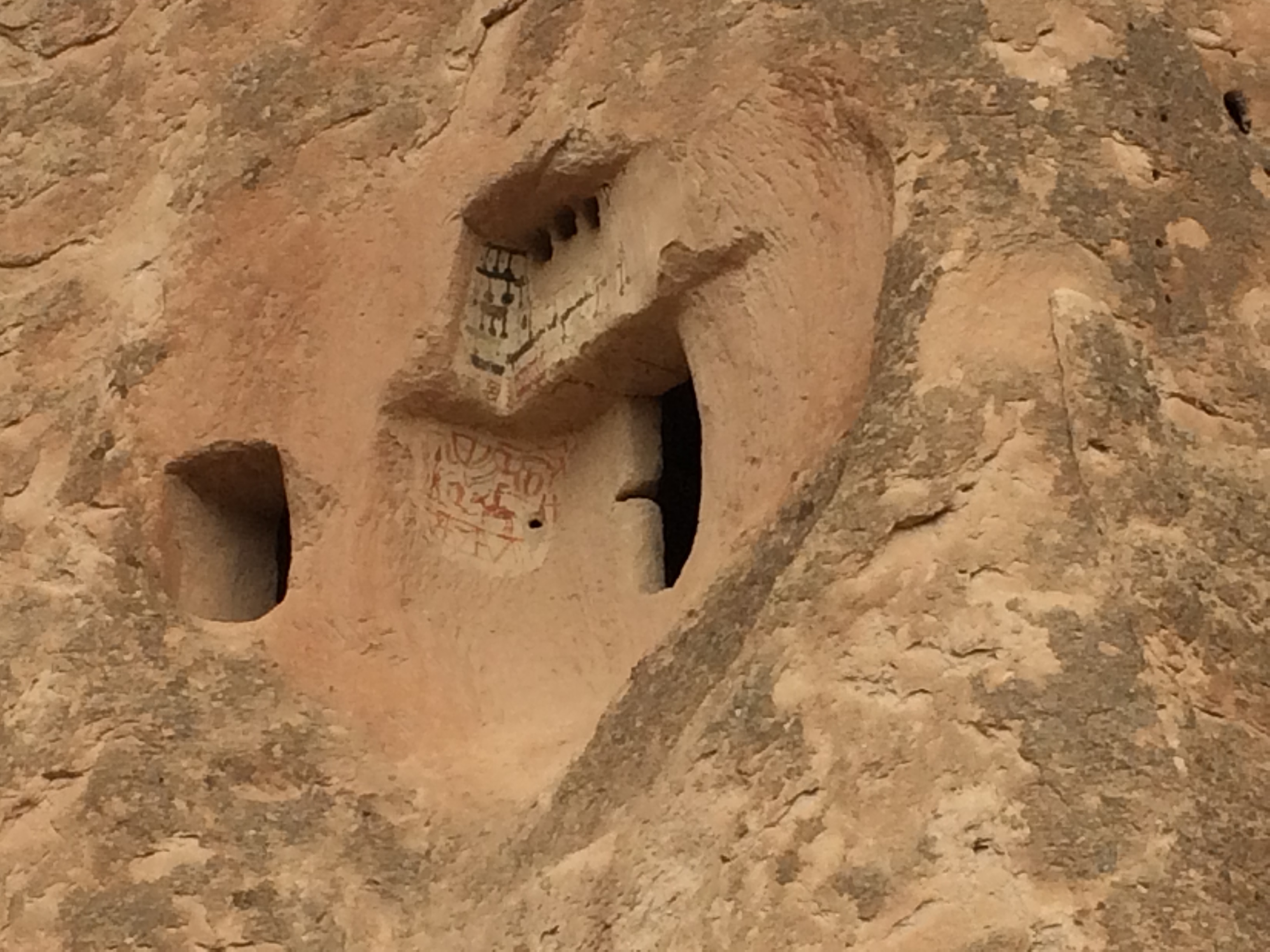 I’m typing this on my phone in our cave suite; we received a free room upgrade a couple days ago. It’s larger, but the 5 am call to prayer is much easier to hear here, and Laurel can’t get back to sleep. The wifi signal is also nearly non-existent from this location. Oh well. On Monday we took a taxi to Kaymakli, one of several nearby underground cities. Before I came to Cappadocia, I thought that early Christians, hiding from and battling Muslims, built these underground cities. I was wrong. Although Christians did eventually live in these underground cities, the Hittites built them many centuries before Jesus’ birth. The one at Kaymakli goes eight stories underground, but only four levels have been excavated. As Laurel, Charlie, and I were walking down the stairs to the cave, a man approached us, offering us his tour-guide services. I declined, and we took a few steps into the busy (lotsa tourists!) labyrinth. He followed us and again offered his services. This time I readily accepted; it seemed everyone else had a personal or group guide. I don’t know how we would have found our way out or known anything about what we were seeing; there were no signs or pamphlets. There were so many large holes in the floor, now covered with grates, that we wondered how any young children survived down there millennia ago. Some of the holes had been carved out of this soft volcanic rock to store and preserve food and allow wine to ferment. Others had been fitted with spikes at the bottom of hidden cave openings to kill animals for food or enemies. Others were used as prisons for miscreants within the cave community. Laurel thought the prisoners’ lives must have been miserable since she guessed that they probably would not have been considered worthy of lighting/burning of oil.