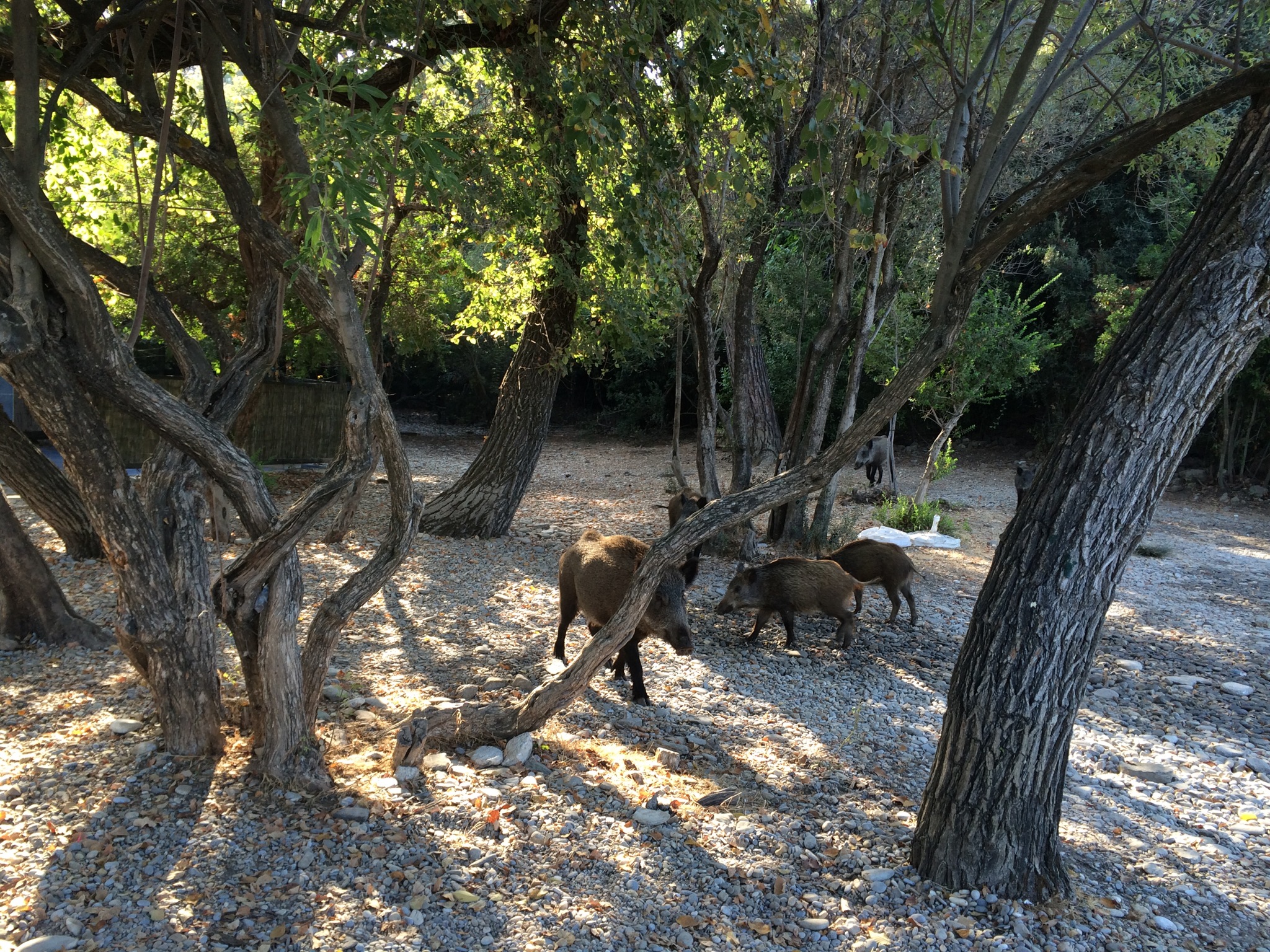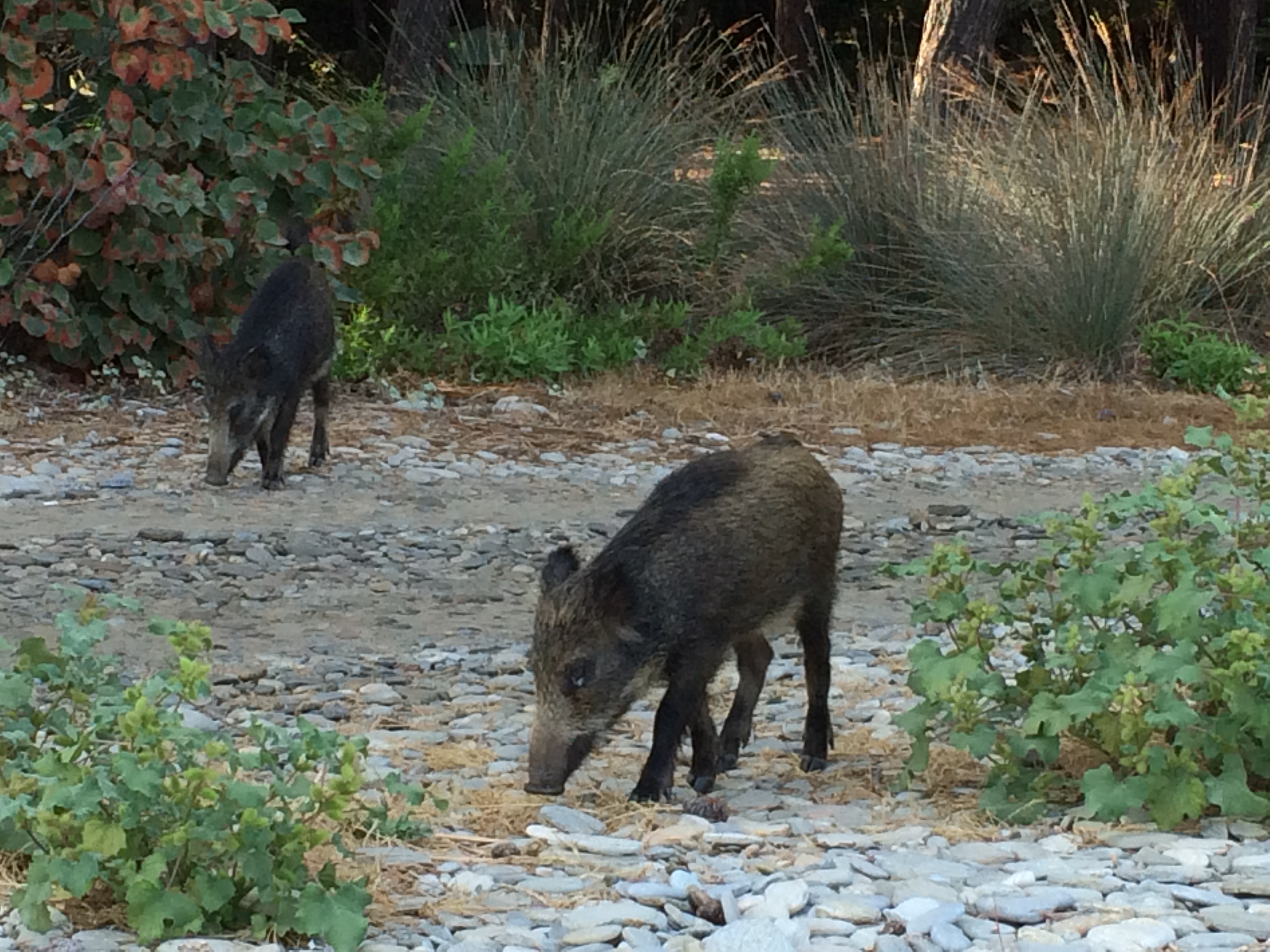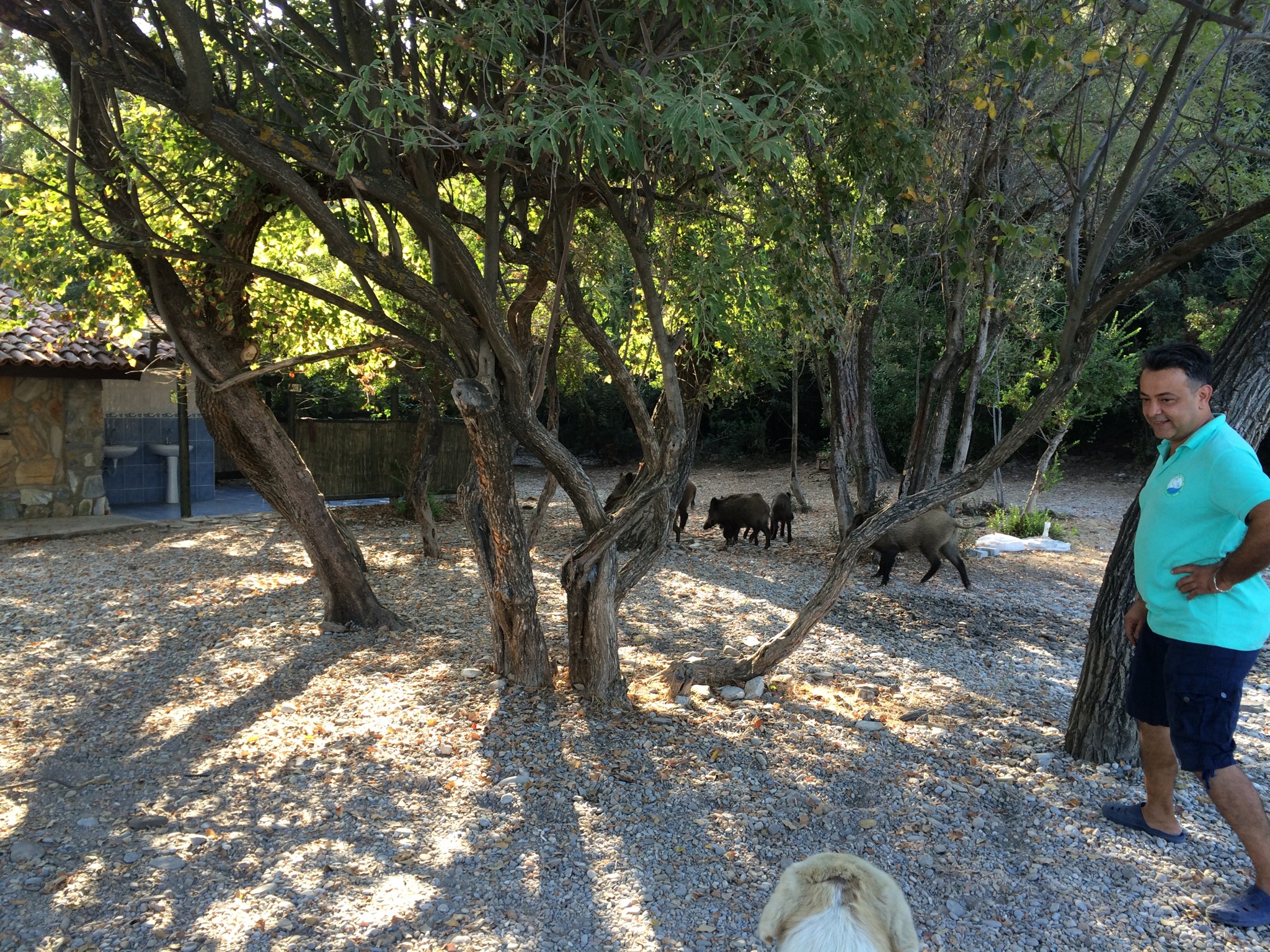 At the second beach we watched wild boars – a few adult females and several babies about 6 months old, according to Görhan, a man working at the nearby snack bar.  Görhan told us that there are between 500-1000 boar in the park and that the males are enormous and very mean.  There was a stray dog next to us, of course – stray dogs and cats are everywhere in Turkey – who eyed the pigs suspiciously and then started barking at them and lunging towards them.  One of the mama pigs ran toward him and snorted, and they did this little dance for about 30 seconds.  Görhan thought it was quite entertaining and tried to egg on the dog, but Charlie was afraid.
