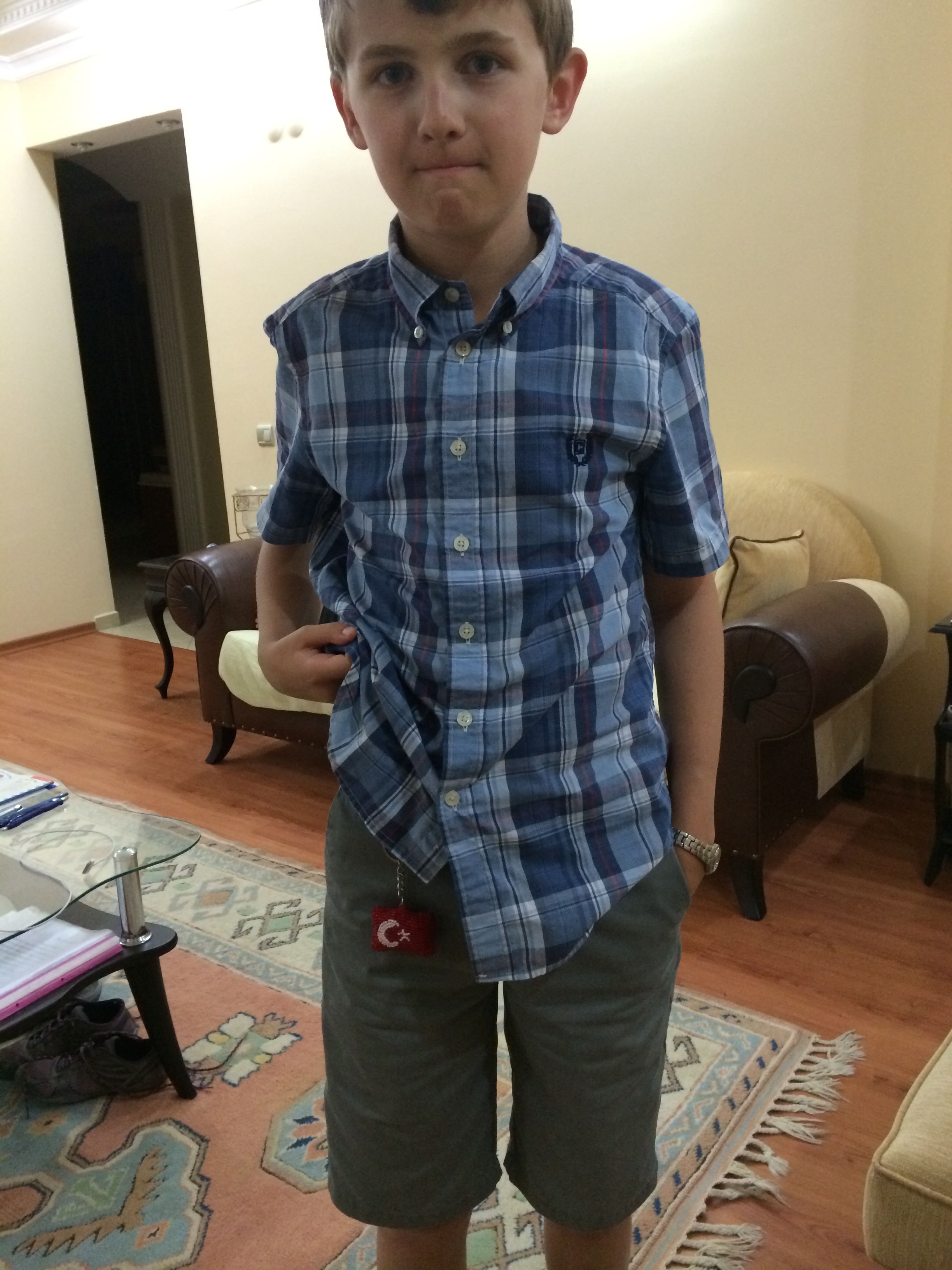 The photo below has nothing to do with Tuesday’s journeys, but I wanted to include a few photos from the other day in Kusadasi. Laurel and I were in a store buying sunglasses while Charlie sat outside with some local merchants. One of the men gave Charlie this beaded, Turkish key chain. Charlie makes friends easily. 🙂