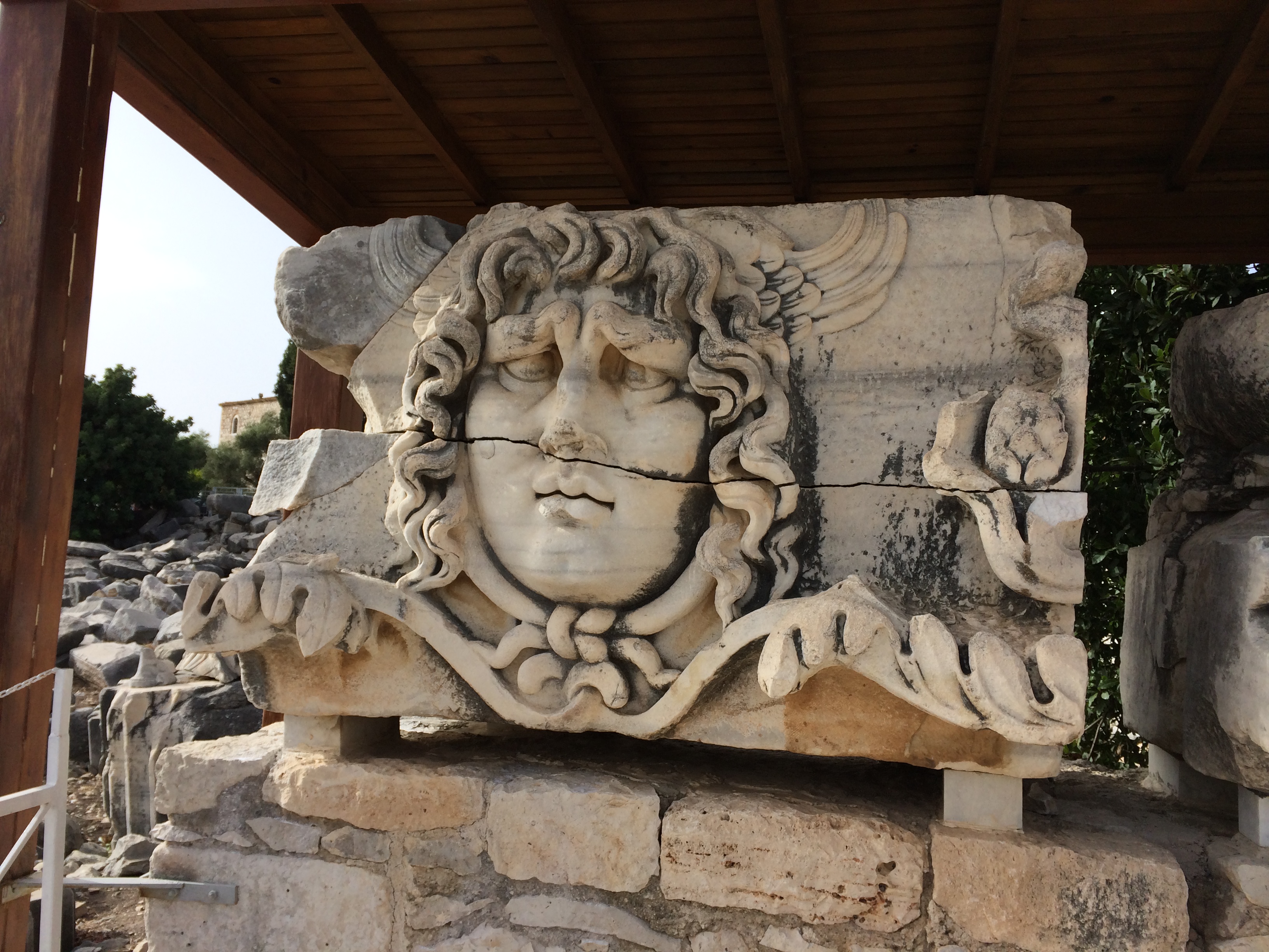 The face of Medusa was carved into pieces of the marble (now on the ground) that went over the columns of Apollo’s temple. Medusa warded off bad spirits and bad emotions such as jealousy before people entered. The eye of Medusa is a popular amulet in Turkey with the “eye” jewelry and household wallhangings for sale everywhere.