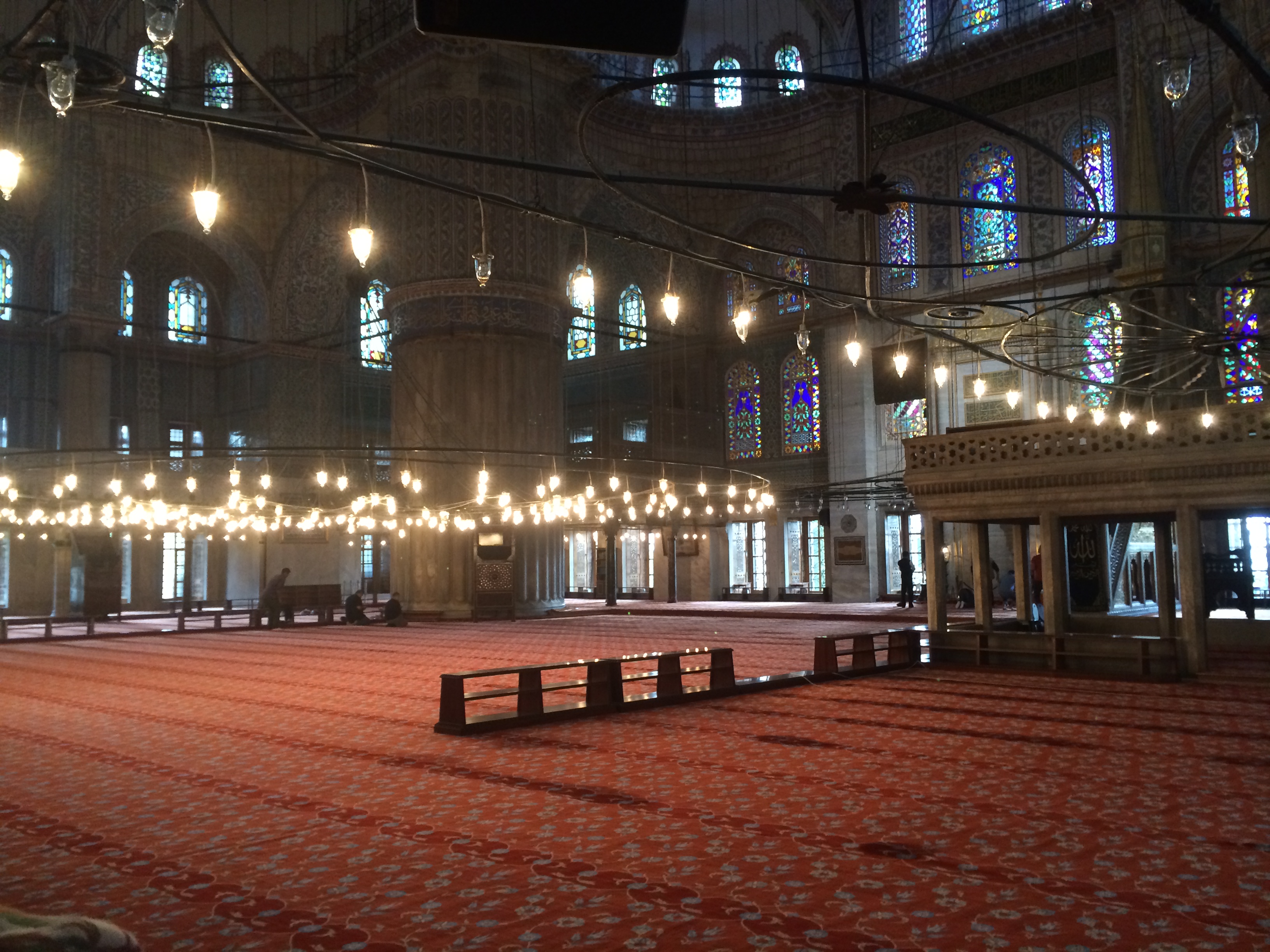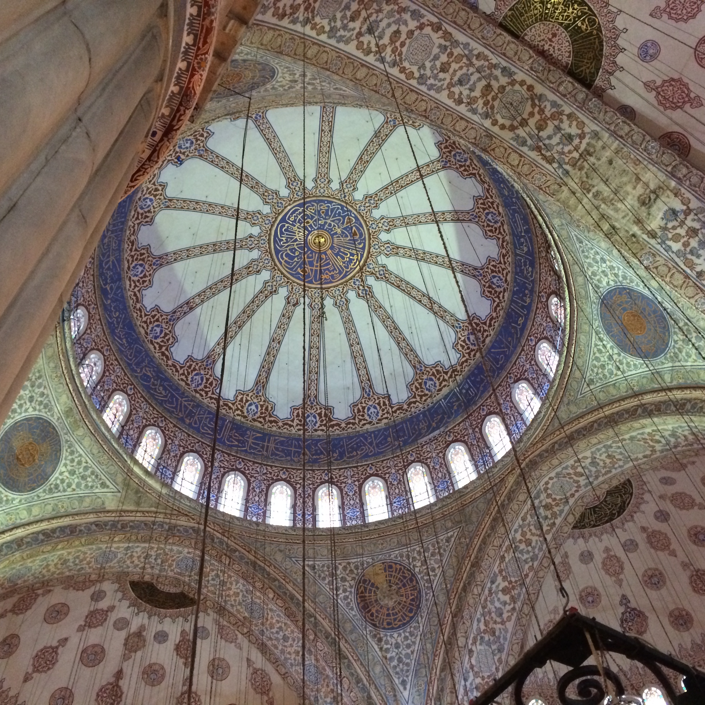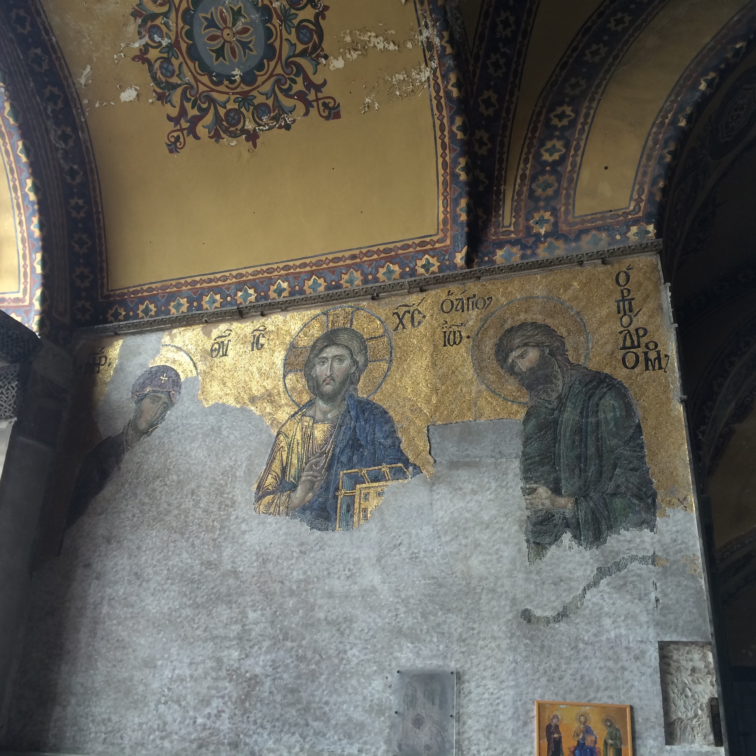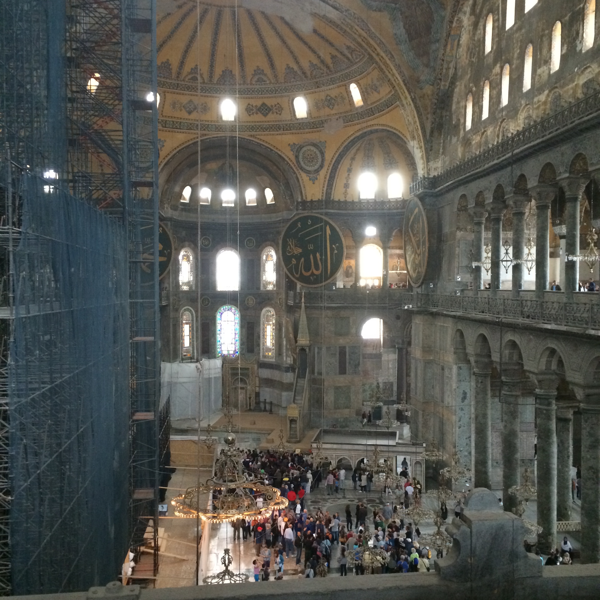 Hagia Sophia (“Holy Wisdom”), built in 537 as an Eastern Orthodox basilica during the reign of Byzantine Emperor Justinian, was turned into a mosque (“camii” in Turkish) by the Ottomans when they conquered Constantinople in 1453. When the Republic of Turkey was established in the 1920’s, Mustafa Kemal Ataturk’s secularization and modernization of the country included turning this landmark into a museum. The building’s changing and fascinating history is on display at every turn. Christian mosaics appear next to Arabic script and Ottoman art. Museum workers are now using scaffolding to prop up the ceiling which is cracking from centuries of earthquakes as well as scraping the plaster off some of the walls to reveal more of the ancient Christian mosaics. The mosaics do not date back to the church’s origins since Christianity went through a period of Iconoclasm in which such artwork was frowned upon. When that period ended, artwork including images – of the Holy Family or other saints – was again permitted in churches, and the Hagia Sophia’s walls were again covered in beautiful mosaics. Islam does not allow images in houses of worship and plastered over most of the artwork. Now in its museum stage, the Christian and Muslim histories are both evident.