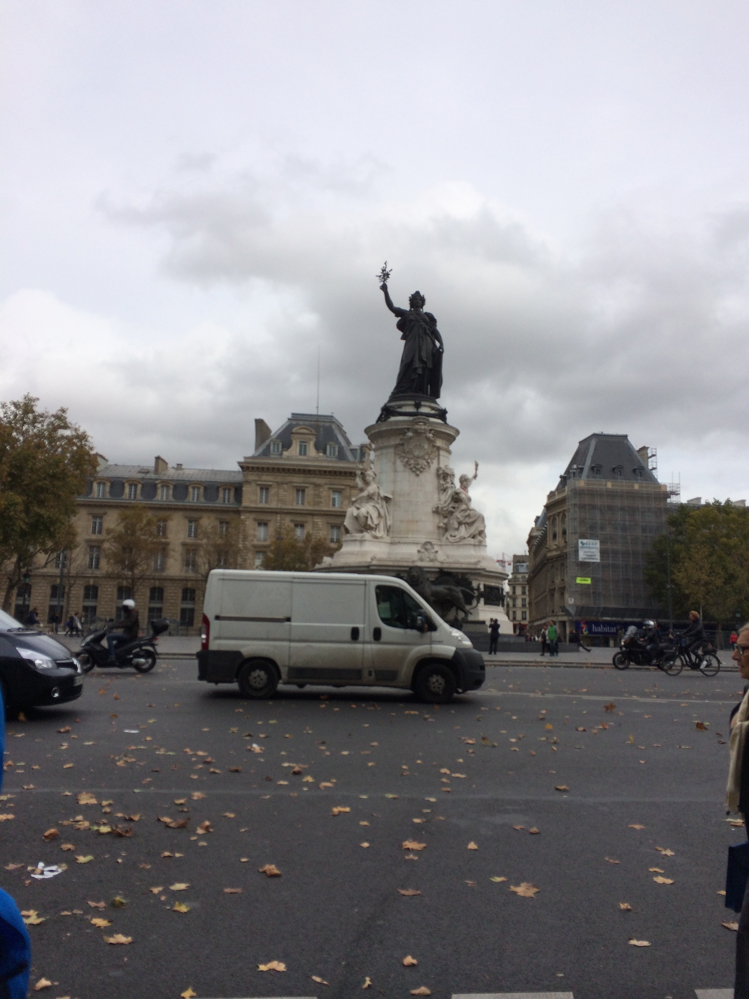 Place de la République with the words of the French motto inscribed around the base: Liberté, Égalité, Fraternité. In the block to the right of this monument is a McDonald’s and a KFC.