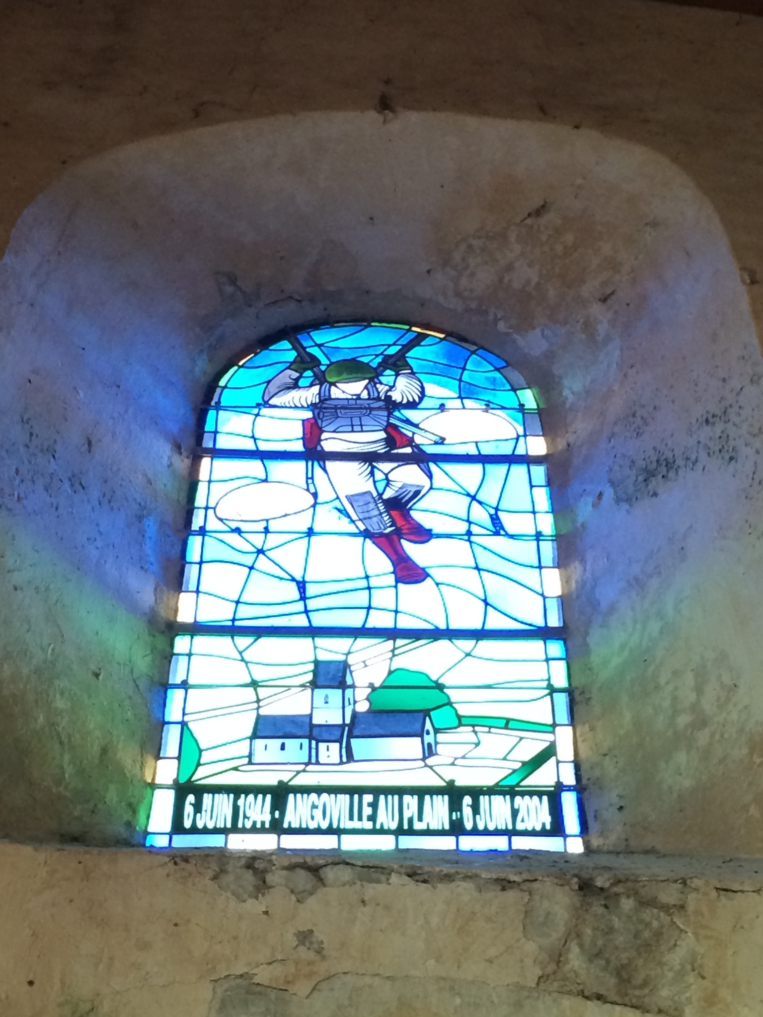 At this church, the windows were blown out during the fighting. The villagers replaced them with a variety of American paratrooper windows.