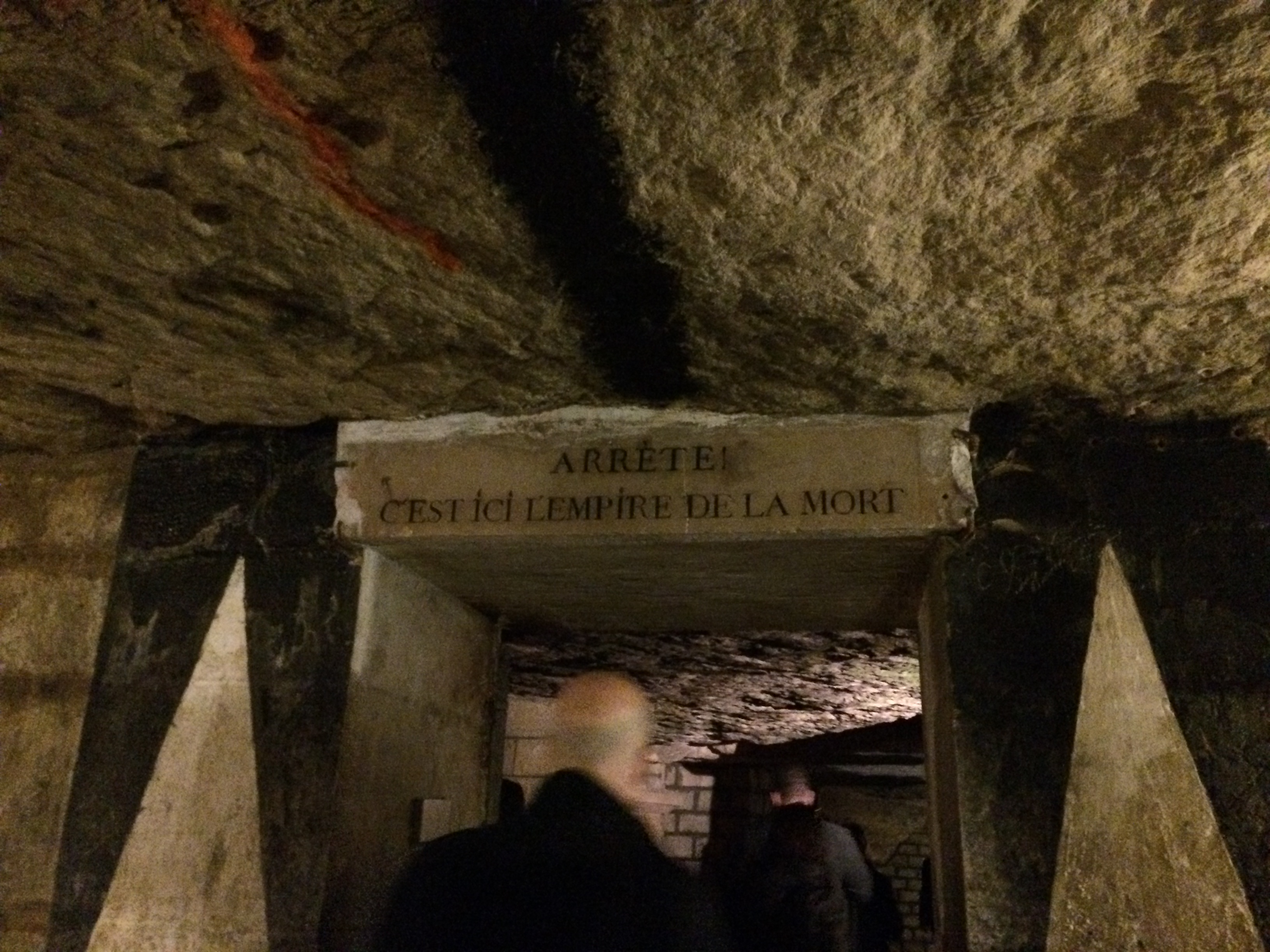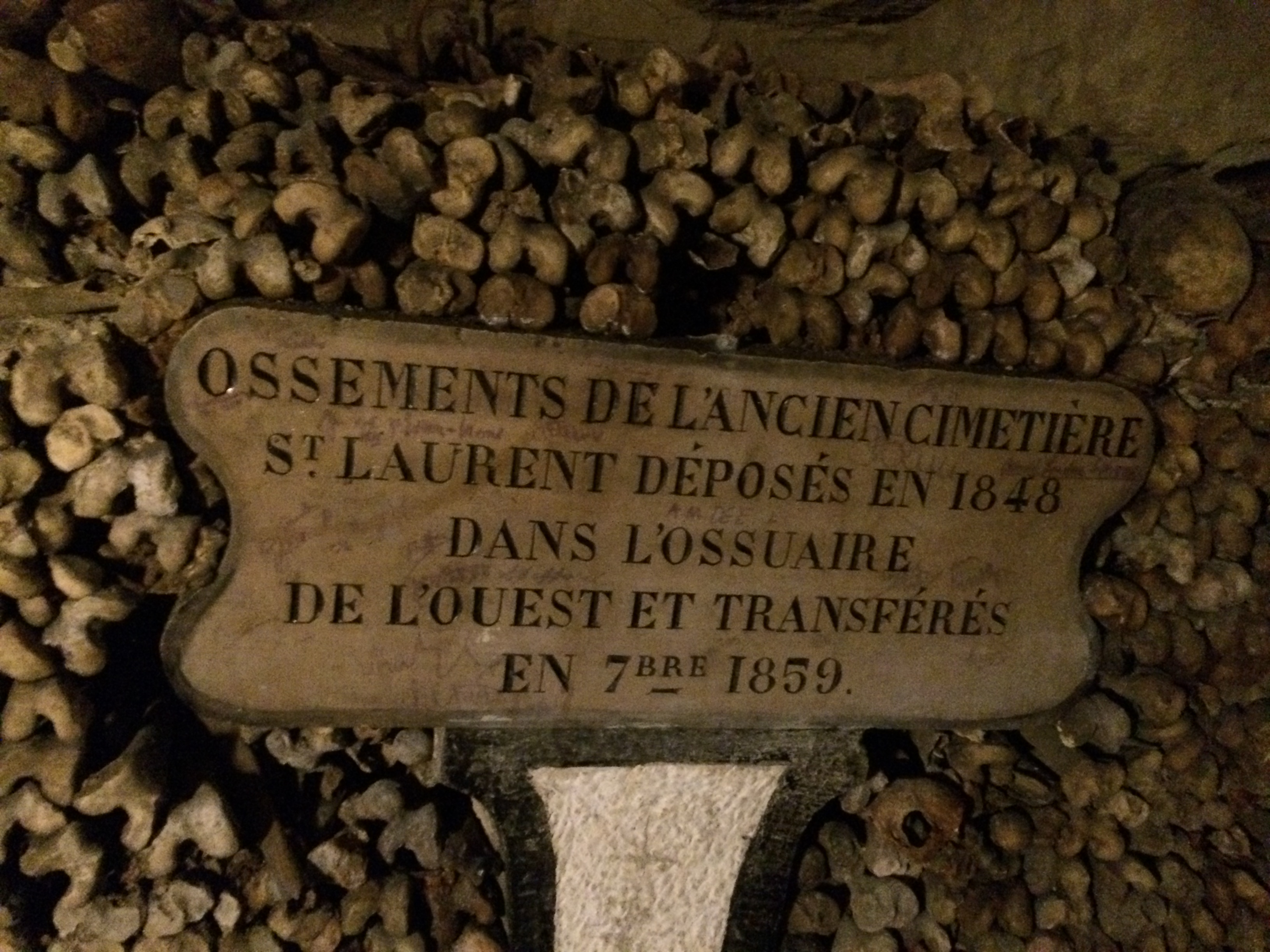 Remember plaster of Paris from elementary-school art class? It’s made from gypsum which is one of the mineral deposits upon which Paris is built. For centuries, and possibly millennia, Parisians quarried the limestone and gypsum left by the ancient sea that used to cover this portion of France. The result is a swiss-cheese effect – a series of tunnels under the city that put the buildings above it on very uncertain ground. Over the past two centuries, engineers have built and reinforced walls within the quarries, but they continue to monitor the spreading cracks of the subterranean ceiling. There are street signs on some of the underground walls indicating what section of the city you’re under. These signs are largely inaccurate now. In the mid-to-late-1800’s, Georges-Eugene Haussmann, under the direction of Napoleon III, directed the destruction of much of medieval Paris and built what we see today. On Thursday we descended 25 meters under the city – under the water and sewer lines, under the subway – to witness the results of all that quarrying and to see how the mined area was used two hundred years ago and the reason it’s now called the Catacombs.