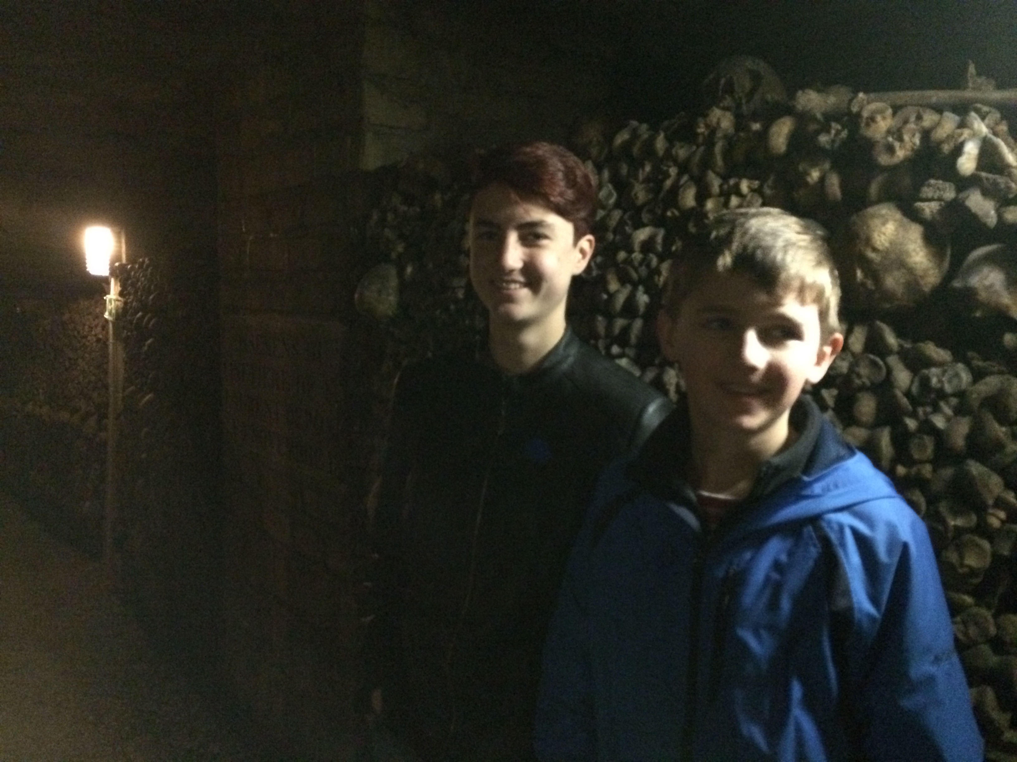 In the late 1700’s, a Parisian wine merchant’s cellar collapsed and filled with, among other things, some bones from the nearby cemetery. He and the other local winemakers (comprising a powerful wine lobby, according to our tour guide) petitioned the government to move the remains from the overused, poorly-maintained cemetery. The government responded by moving an estimated six million skeletons from a number of cemeteries over the course of decades to the Parisian quarries. They are stacked so neatly, and in some cases artistically, that I didn’t think about until now what was done with the pelvises and ribs that couldn’t be stacked so nicely. I read another blog that says those bones are in other rooms that are not part of the official tour. The Paris mines are extensive; the view from the 90-minute official tour is a very small piece of that. Some people find their way into the unofficial parts, but there are a few tourists each year who have to be rescued when they lose their way. I decided we should just stick to the guided tour.