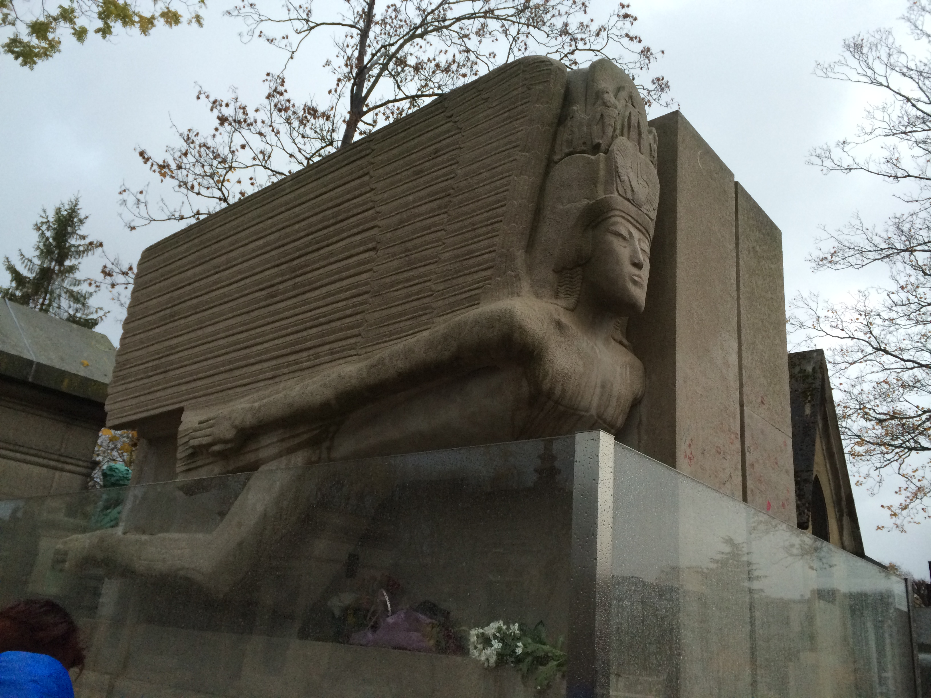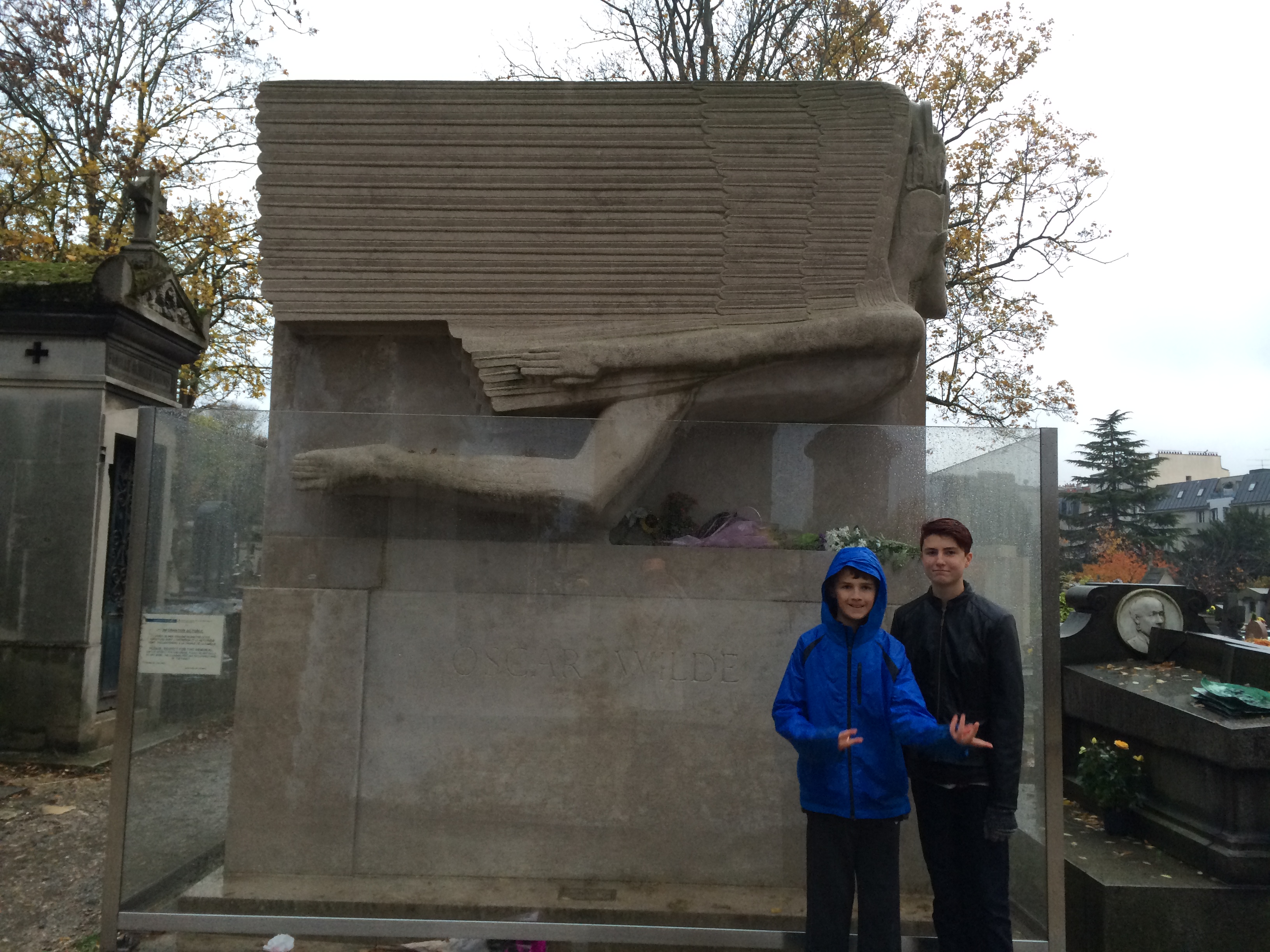 Charlie inexplicably plays air bass at Oscar Wilde’s grave. Wilde, who died of meningitis in 1900 after two years of prison and hard labor leading to poor health, had recently been exiled and was estranged from his wife and children. An anonymous donor paid for his tomb which a friend designed. So many female mourners have kissed the tomb that there are lipstick marks on the side of it, and a barrier has been erected to prevent further damage.