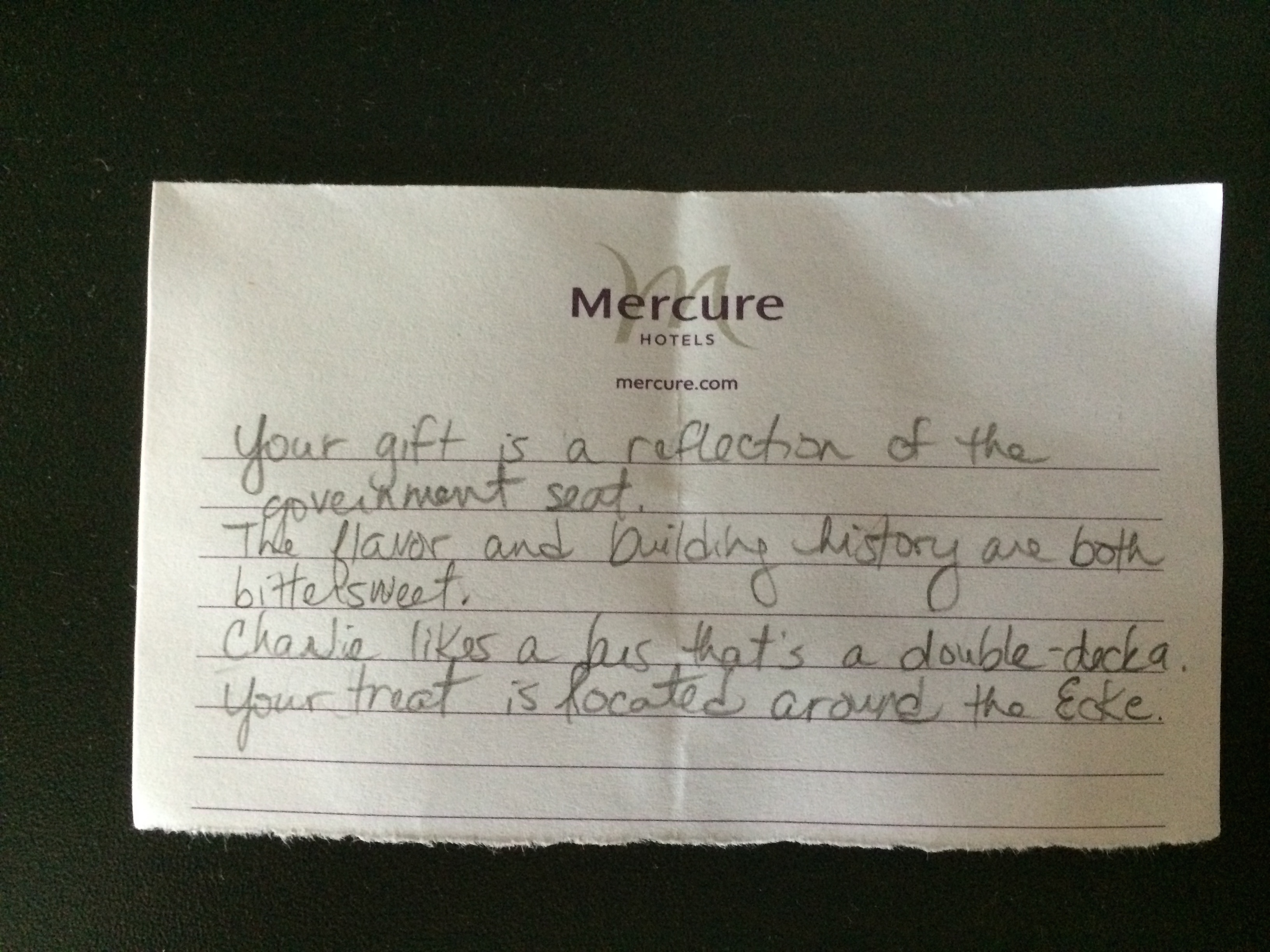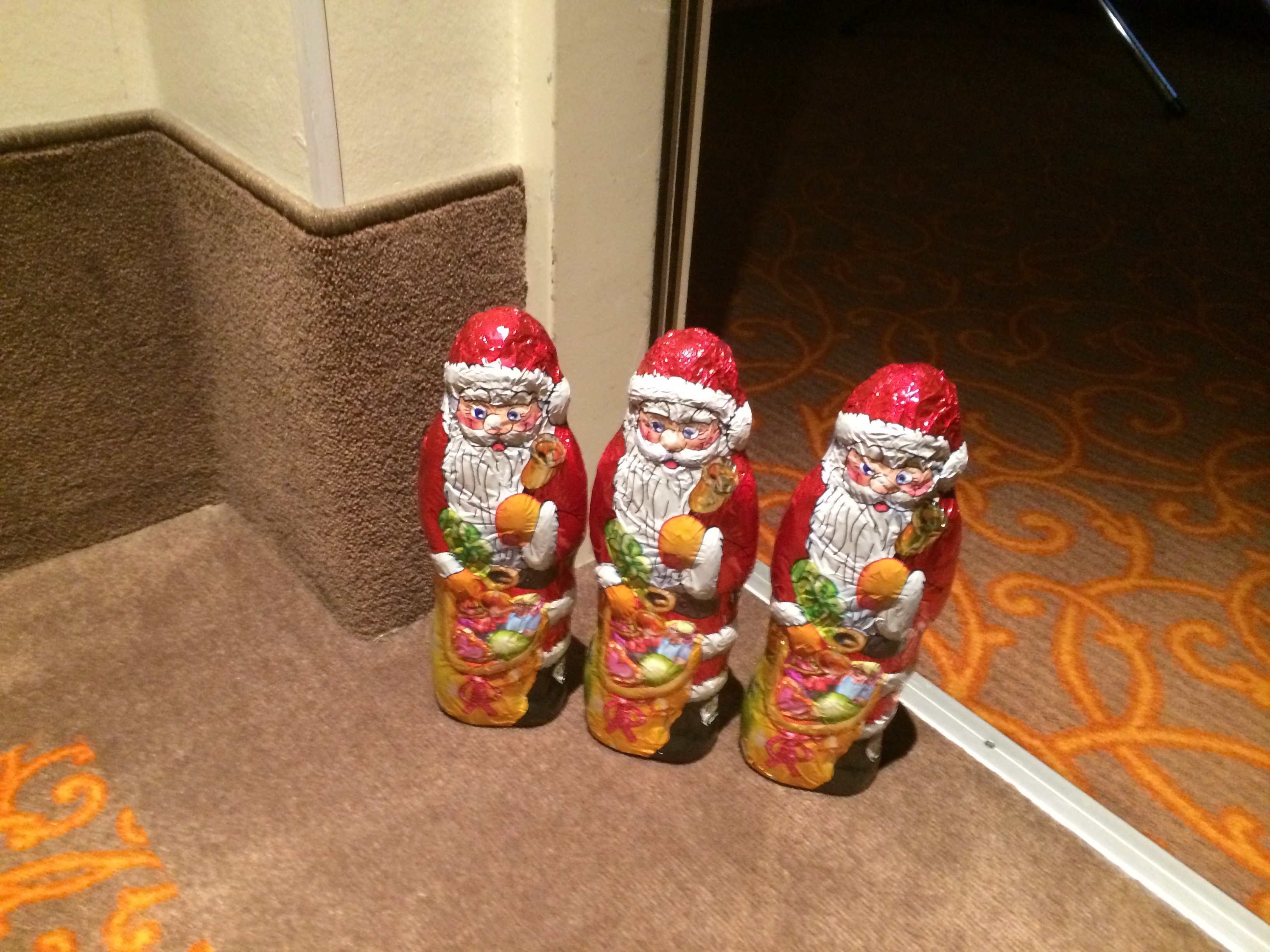 There’s a fantastic chocolate store near our hotel with all kinds of intricately detailed decorations done in chocolate. I bought the kids their St. Nicholas Day chocolates there, but Charlie refused to eat his when we discovered his bar was milk chocolate instead of dark. He’s become quite the food snob. I wrote rhyming clues for the kids about where in the hotel room they could find their treats (which the kids had already seen me buy). Laurel’s chocolate featured a German landmark. I was thinking aloud about the clue I would write: “My friends sometimes call me Brandenburg Kate,” I began. Laurel groaned at the absurd rhyme and then reminded me that the image on the chocolate is the Reichstag building, not the Brandenburg Gate. 🙂 Also, the hotel staff left us three, tall, chocolate Santas outside our door.