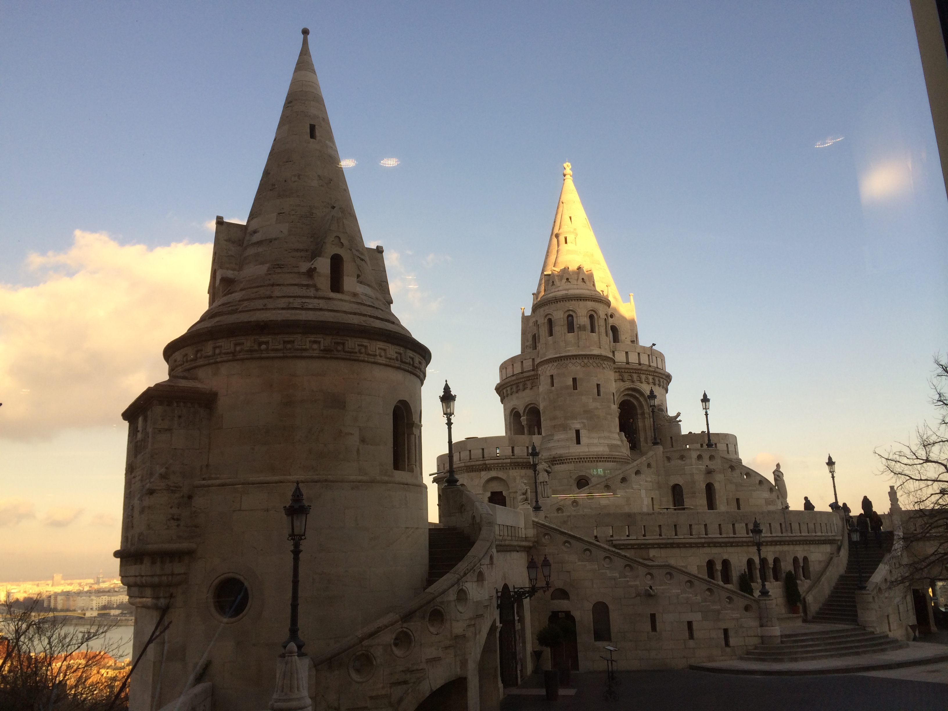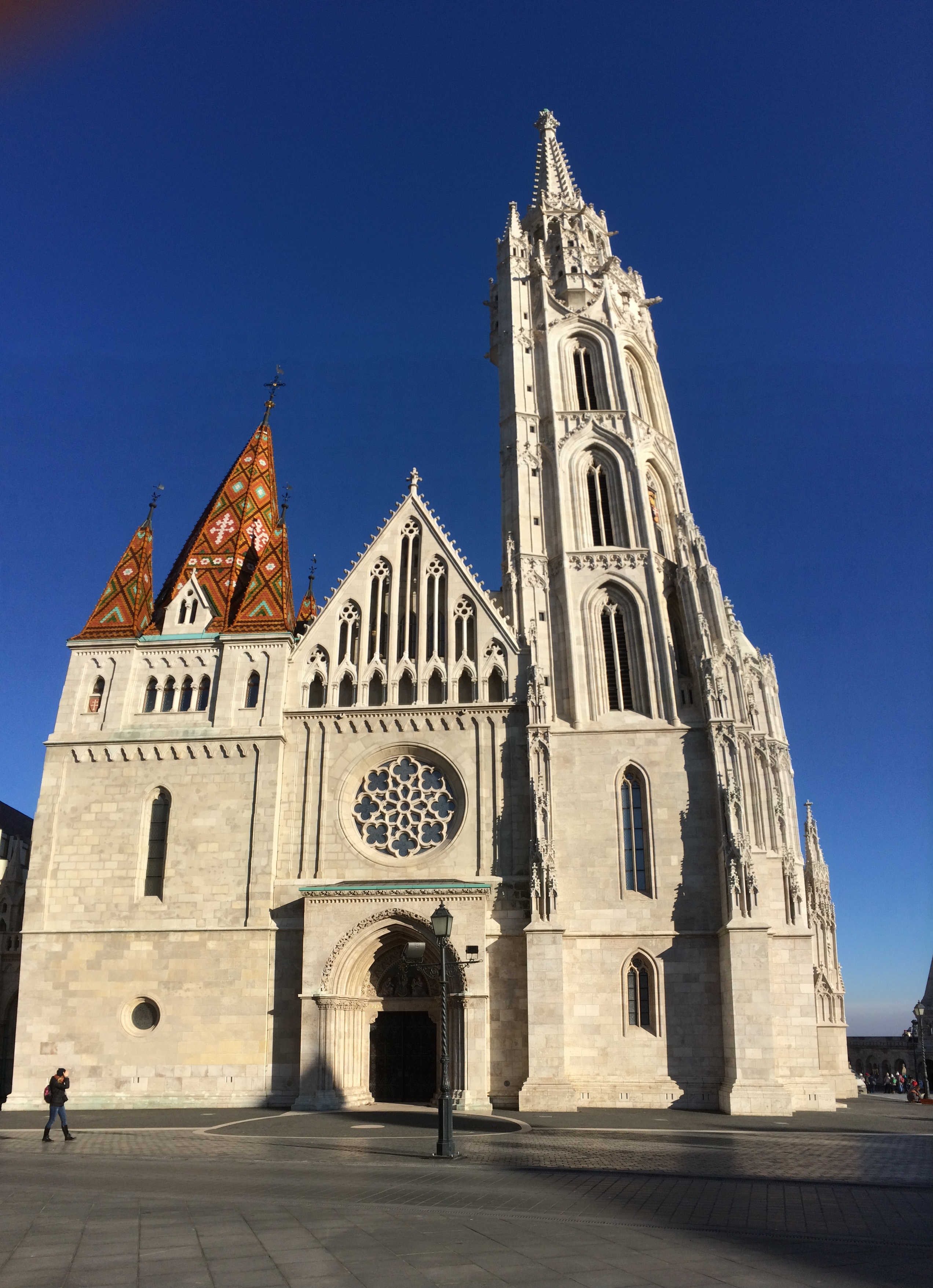 Below: Fisherman’s Bastion and St. Matthias Church – possibly the prettiest buildings we saw on our three-week trip, and that’s saying something!  It was hard for me to get a good picture with the sun washing things out though.  Although the church steeple looks curved on  one of the photos below, it’s just because of the pano function on my phone camera.  The steeple is actually quite straight and steeple-like.