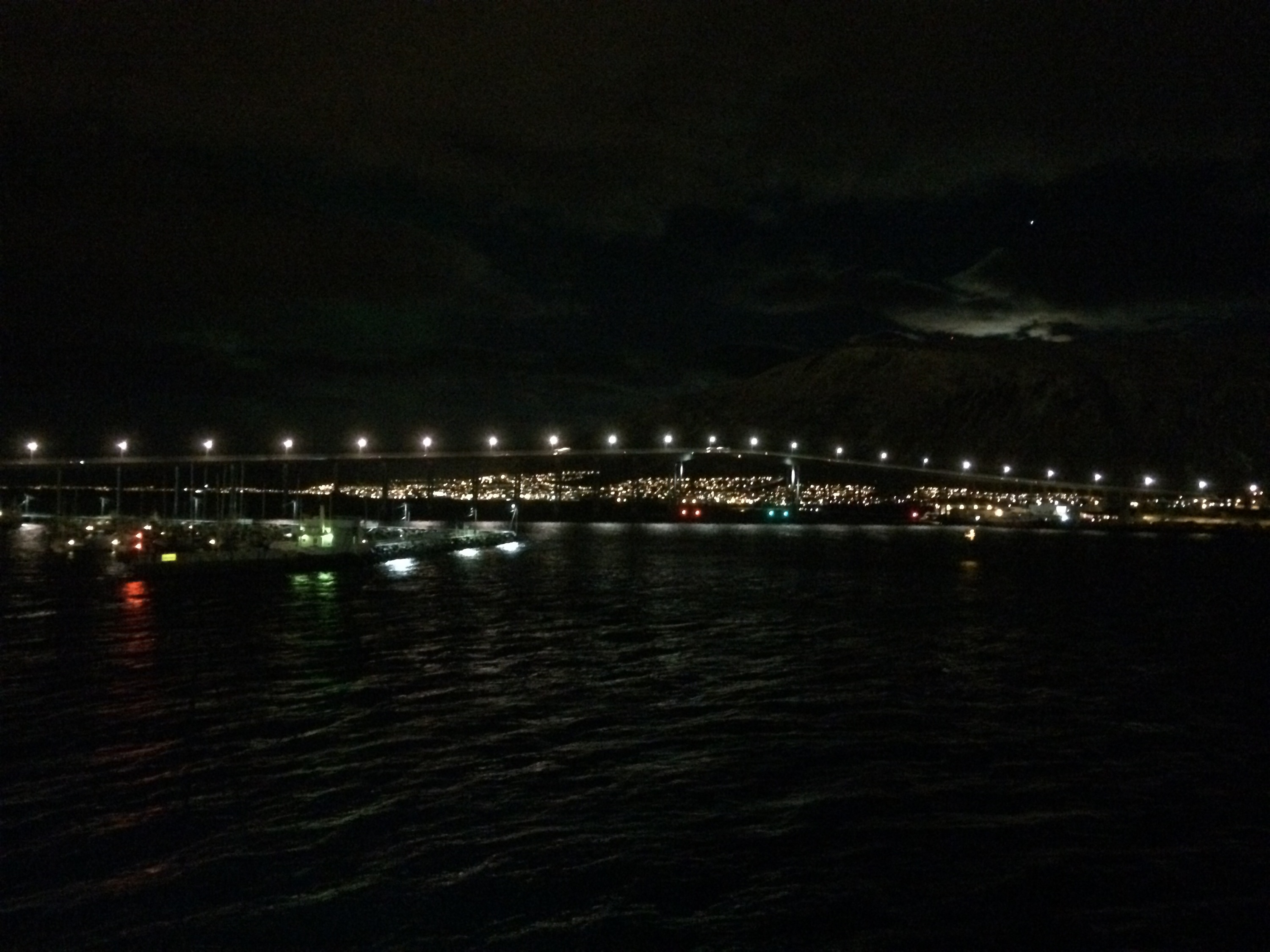 Last night after the kids and I had put on our jammies and settled into our bunks on the MS Nordkapp and Laurel and I had attempted to sing all of “American Pie,” an announcement came over the PA: “Ladies and Gentlemen, you can now see the Northern Lights.” We quickly dressed and hurried down to Deck 5. Laurel arrived a few minutes before Charlie and me. When we met again in our cabin near midnight, she said that she had seen “residue” of the lights. Charlie and I didn’t see them. Today is cloudy so we won’t see them tonight. We will go on a bus tour Sunday night in Tromso where the bus driver will get the latest weather and light information and drive us to see them if possible.