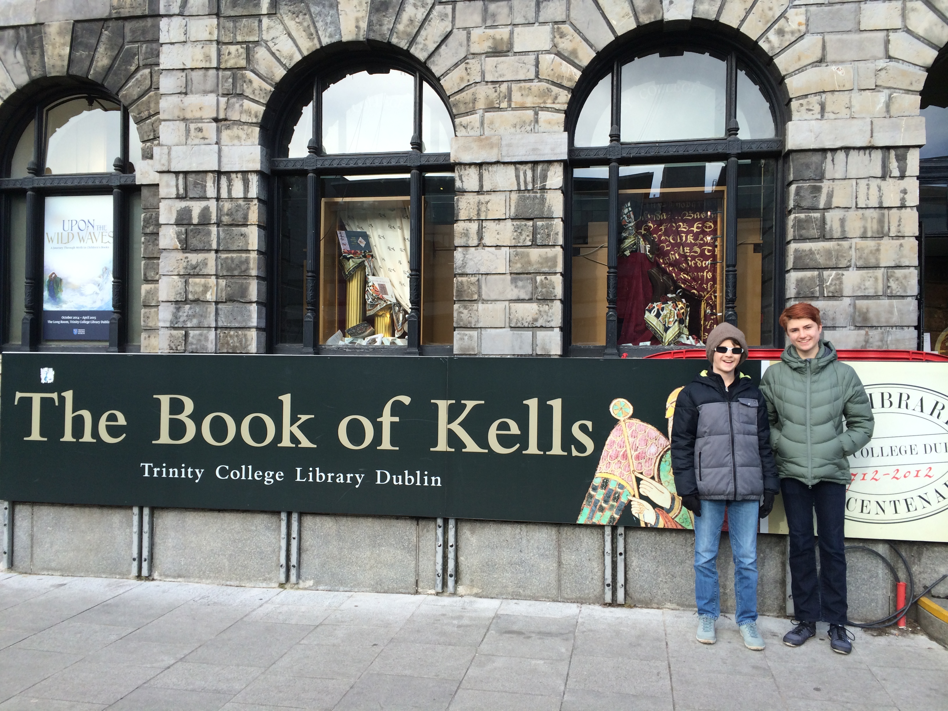 We flew from London City Airport, one of five London airports, to Dublin Sunday night and enjoyed our taxi driver’s lilting brogue and commentary on the ride from the Dublin airport to our apartment.  The tiny apartment requires planning and coordination of movements in order to dry the laundry on the drying rack and move the second mattress from its vertical daytime position in the bedroom to the living room floor at night.  The night we arrived there was a cot and mattress set up in the living room, but Laurel knelt on the cot to reach something on the nearby cabinet and heard a wood plank split beneath her knee.  We folded up the cot, and I spent a mostly sleepless night on the thin, foam mattress on the floor.  The next day we walked to Mattress Mick and bought a real mattress which was delivered Tuesday.  Daragh and his boyfriend who own and manage this unit do a lot of talking but are not terribly concerned with such matters.  (Daragh scolded me for allowing Laurel to kneel on the cot as it was not built to withstand that pressure.)  Oh well.  We’ll be at our own home in Denver soon, sleeping on real beds. Monday (before visiting Mattress Mick) we walked to Trinity College where Charlie took one look at the campus and announced, “This looks like Auschwitz.”  It kind of does.  Auschwitz is mostly two-story, brick dormitories built for Austrian soldiers when the Austro-Hungarian Empire controlled Poland in the early 20th century.  (Not to be confused with Birkenau which was built specifically as a Nazi death camp and which the Soviets mostly bulldozed upon liberation.)  Trinity College has mostly stone buildings but some brick.  Anyway, we were there to go to the library and see the Book of Kells, four books comprising the four Gospels, written and beautifully decorated with Celtic art, about 800 AD.  The books were kept at the Abbey of Kells, thus the name, for centuries before being moved to Dublin for safekeeping in the 1600’s.  Trinity displays two books, under glass, at a time and rotates them.  Of course, photography is prohibited, so I have none to show here; but I could hardly believe how old the books are.  They’re in excellent condition, and the art and writing – on calfskin – look perfect.
