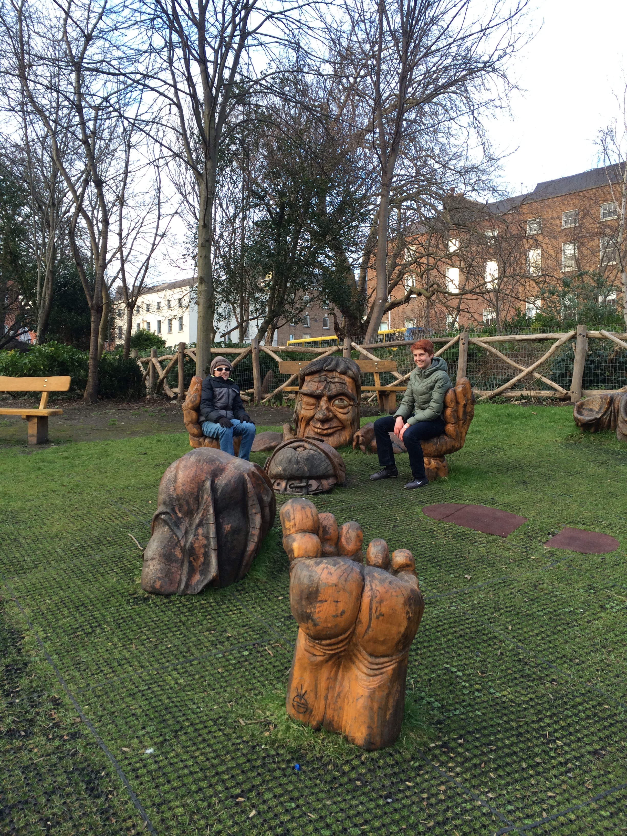 After Trinity we walked to Merrion Square, a beautiful park across the street from Oscar Wilde’s childhood home.  The park pays tribute to Wilde with a statue of him as well as a buried, wooden giant – based on Wilde’s short story, The Selfish Giant.   IMG_7611 IMG_7613 IMG_7627 IMG_7632 Tuesday and Wednesday we planned activities and ran errands, including buying mass transit cards.  There’s no subway here, but there are double-decker buses.  Since our apartment is centrally located, I don’t think we’ll be riding the bus much; but the payment system – inform the driver of your destination and pay the exact amount of one of 13 possible bus fares depending on distance traveled – seemed overly complex, and preloaded RFID cards seemed simpler to deal with.