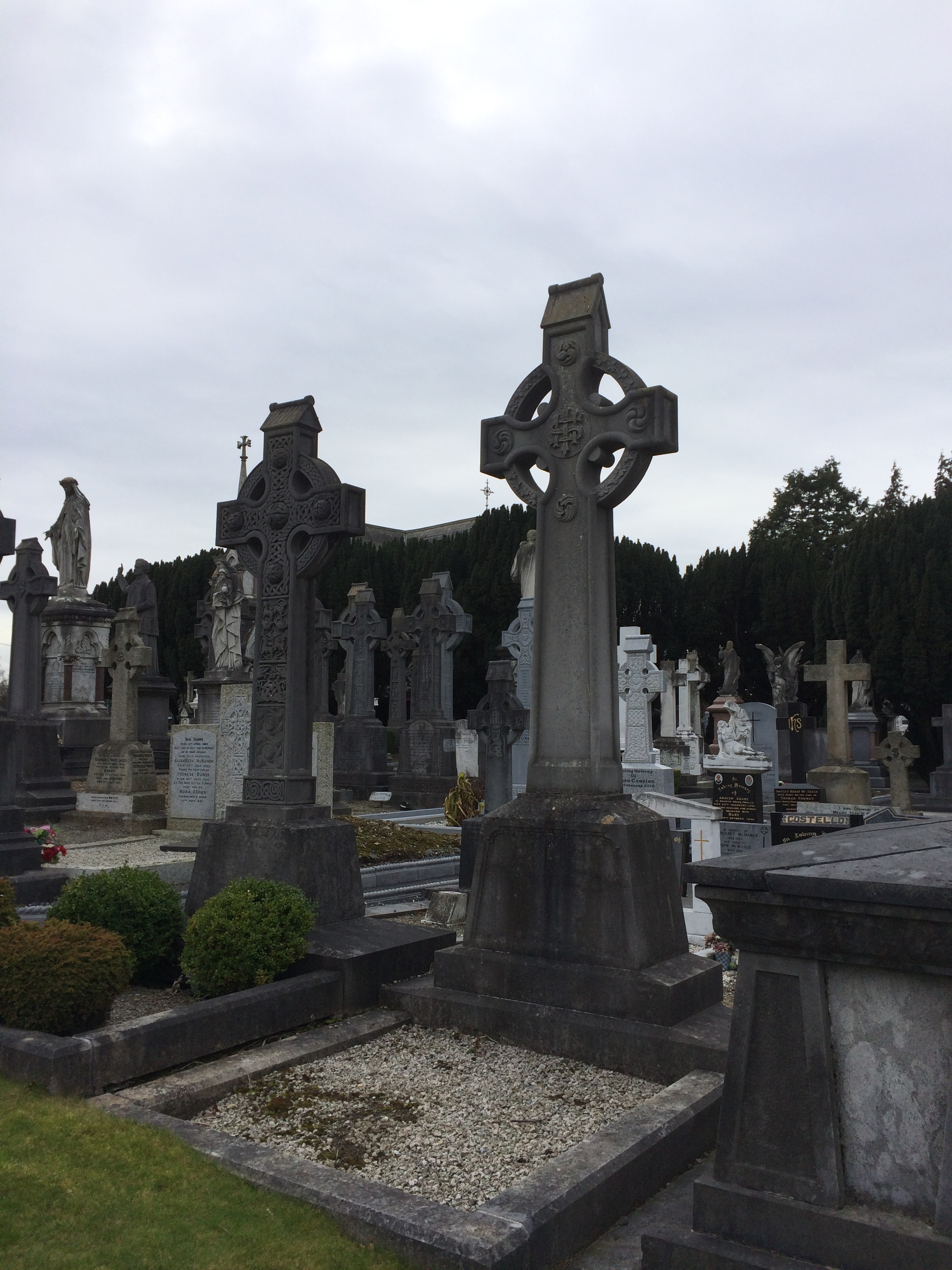 Today – Thursday – we walked four miles round-trip to Glasnevin Cemetery where we took a 90-minute, group tour with a different Daragh, who also has the gift of gab.  Holy crap, that man can talk.  Of course, that’s a good quality in a tour guide; but man, did he cram a lot of historical facts into those 90 minutes.  He was all business – no smiling, no Q&A, no small talk.  I’m trying to remember the main points, but the short story is the Irish had no rights under English rule.  (The cemetery, where 1.5 million people are buried, was built/started in the 1830’s and coincided with the Irish Independence movement which ended with the War of Independence and Irish independence in 1922, followed by the Irish Civil War because of disagreement about Northern Ireland’s remaining part of the UK.)  Under English rule, Catholics – the vast majority of the Irish – could not vote, go to school, or own land (other than a tiny plot, large enough only to grow potatoes as an efficient source of calories – thus the devastating effects of the potato blight and resulting famine).  Laurel and I were reading online that the combined population today of Northern Ireland and the Republic of Ireland is still significantly less than it was before the famine.  Isn’t that amazing?  The world’s population has exploded; Dublin is a city of immigrants today with many Indians and Chinese as well as Americans and every other nationality.  And still the country has not rebounded from the famine.