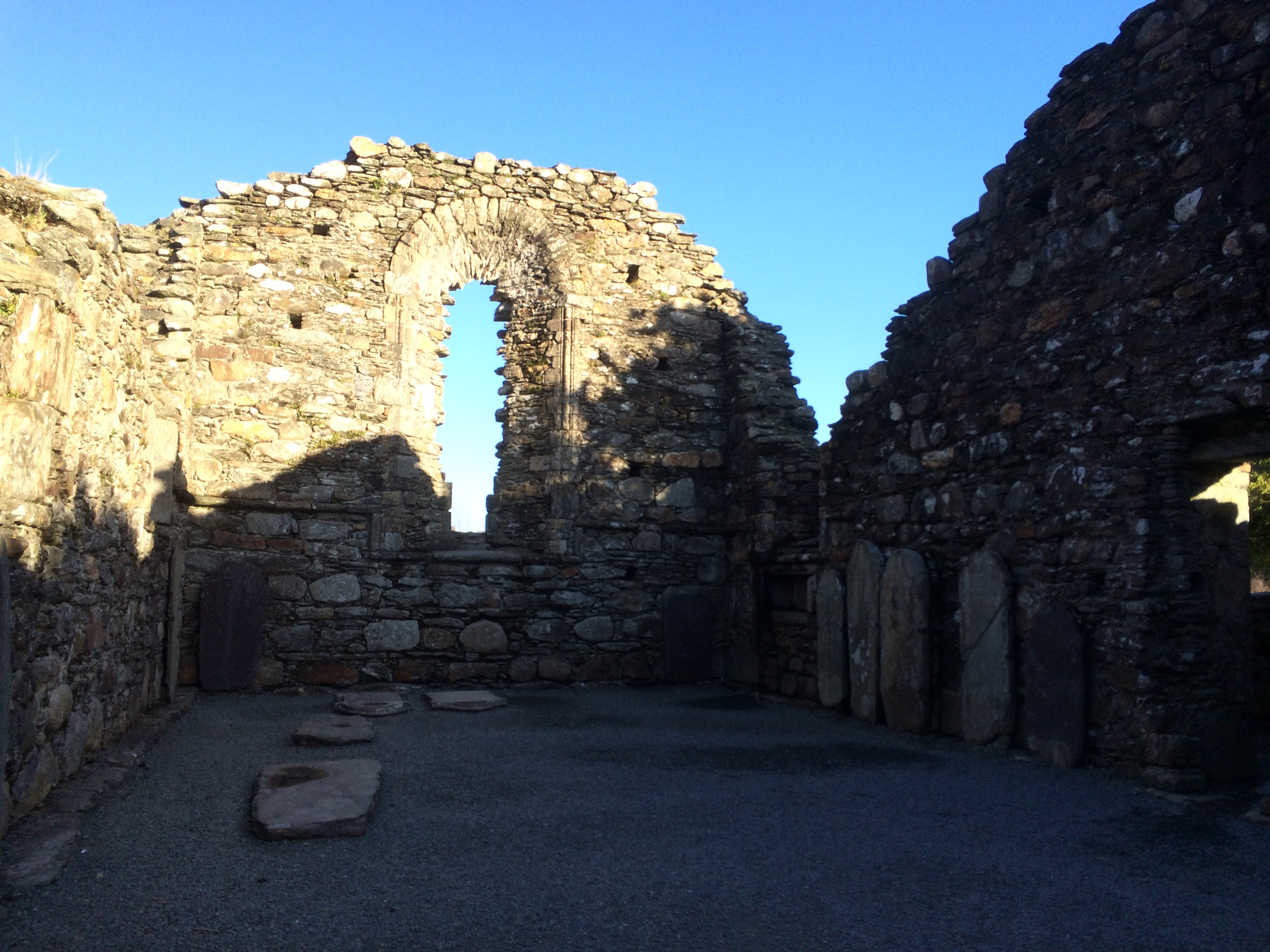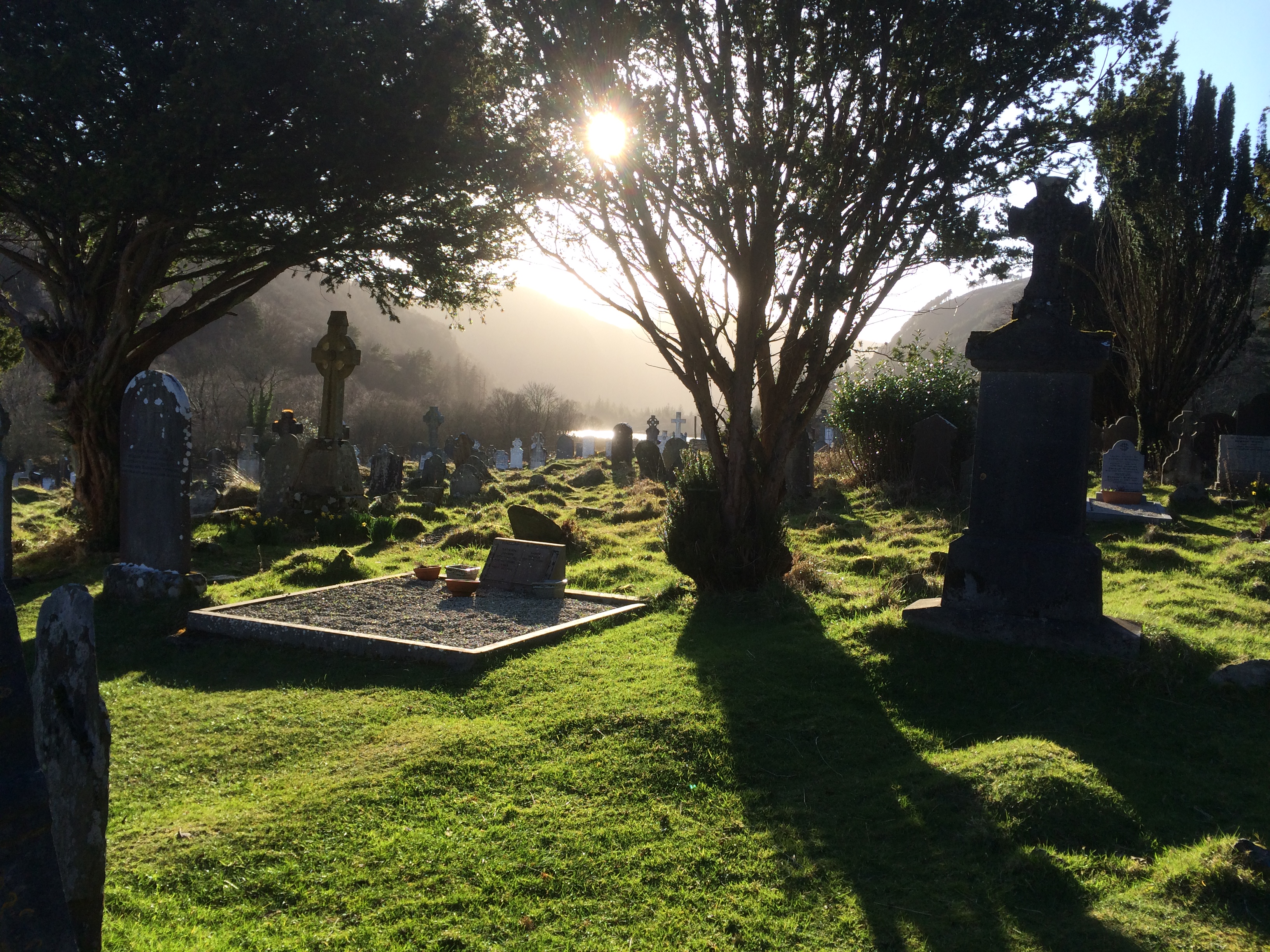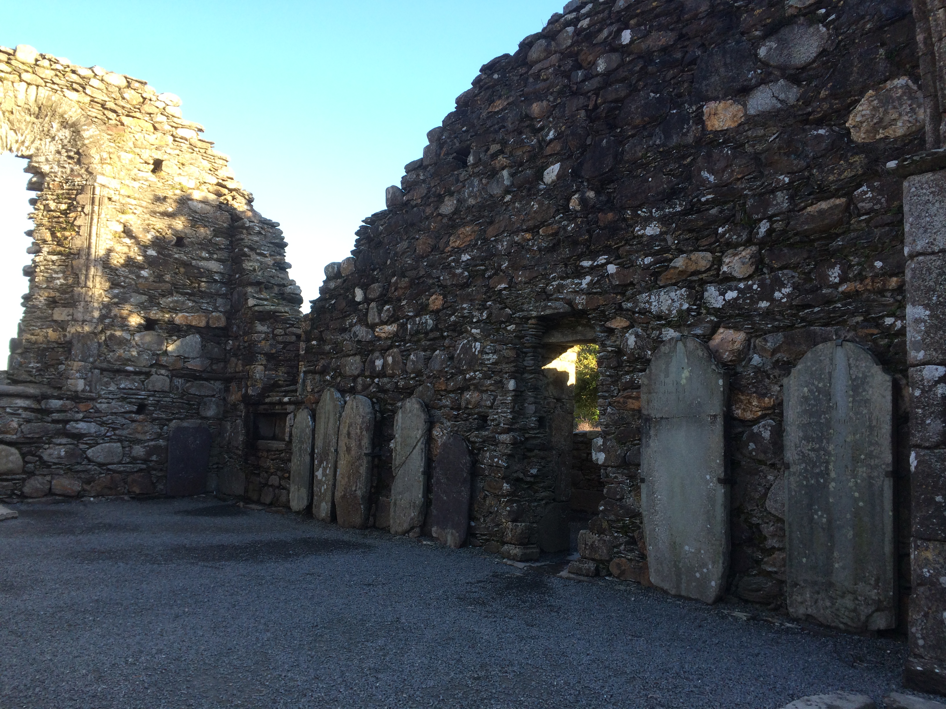 We drove to beautiful Glendalough Lake and walked around a few minutes and then to a monastic city started by St. Kevin in the Middle Ages. The builders of this monastery were excellent stone masons, and little improvement has been necessary to the tower and other structures over more than a millennium. (The cathedral’s roof is now gone, but the walls are in good shape.) John also talked about the Irish saving great works of Roman and Greek origin through transcription/copying by Irish monks. After the Germanic tribes sacked Rome and the libraries were destroyed and the Dark Ages had truly begun, Ireland was a beacon of hope and eventually started monasteries in mainland Europe bringing back some of Europe’s sacred treasures and traditions which had been kept safe from the Vandals. I remember learning that years ago when I read How the Irish Saved Civilization by Thomas Cahill. I thought the book was going to be humorous because what do civilization and the Irish have to do with each other? Instead it was quite an enlightening read.